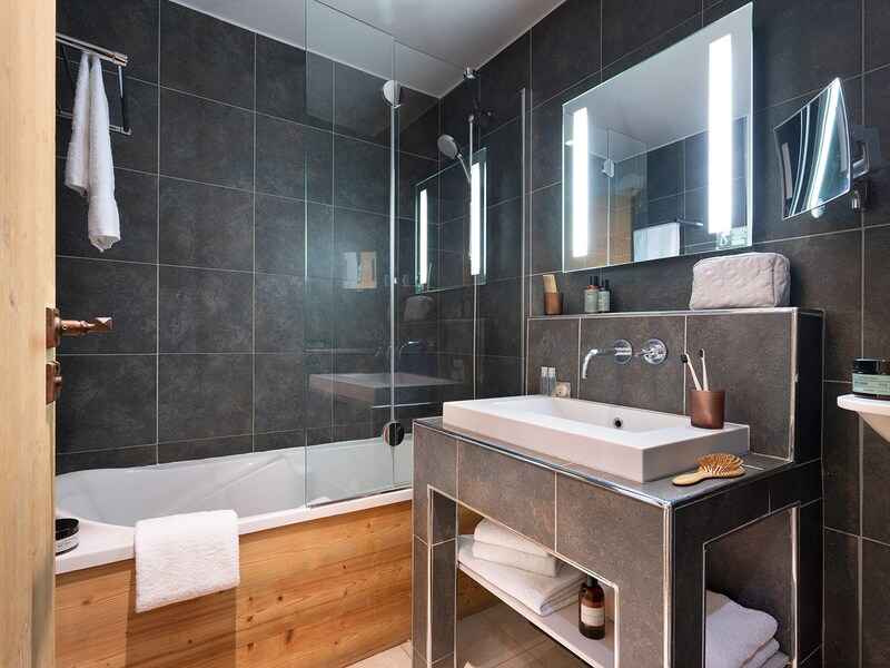 intérieurs favorisent les lignes contemporaines tandis que l'utilisation généreuse du bois apporte une note d'authenticité, dans l'esprit de la savoie.