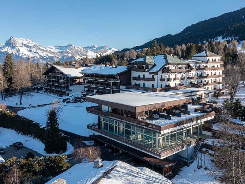 La résidence, constituée d'un ancien palace et d'un grand chalet de style savoyard, est établie dans un parc de 5 hectares, face au domaine skiable du mont d'arbois. elle se situe à 4 km du centre de la station, et à 400 m des télécabines.
