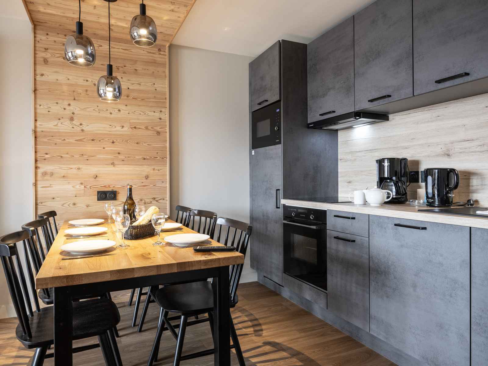 Cuisine ouverte avec un espace repas avec table à manger et chaises
