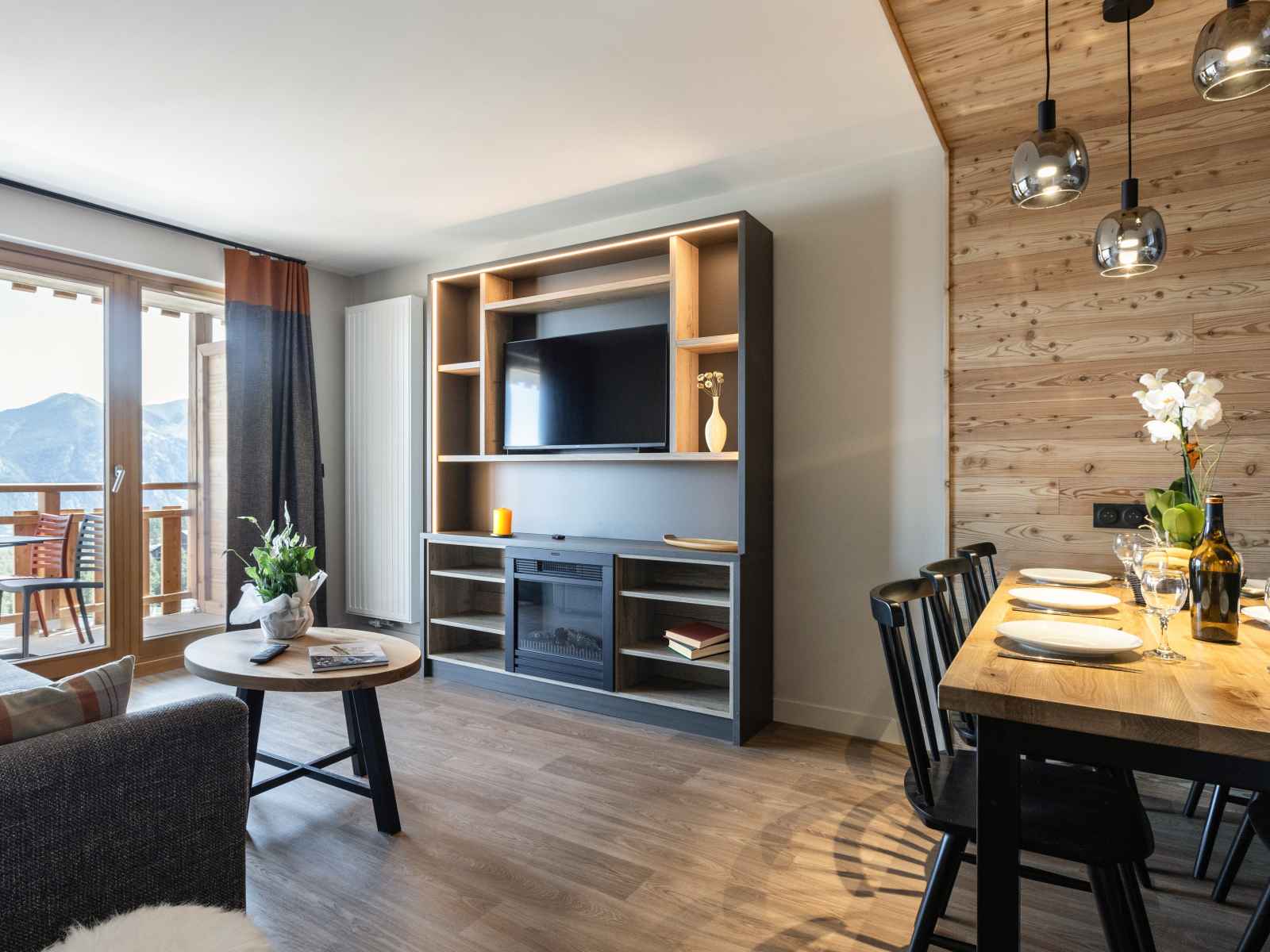 Résidence idéalement située à 15 minutes à pied du front de neige. equipée d'un espace aquatique, d'un salon avec bibliothèque, cheminée, espace gaming et salle de cinéma, le confort et la relaxation seront au rendez-vous pour votre séjour.
