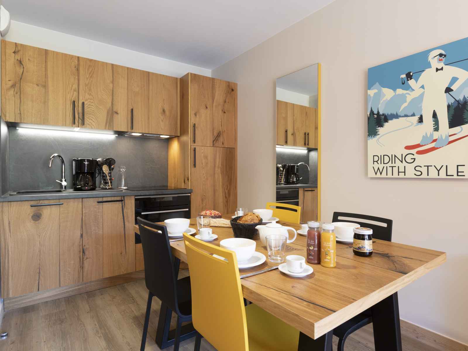 Cuisine ouverte avec espace repas avec table et chaises