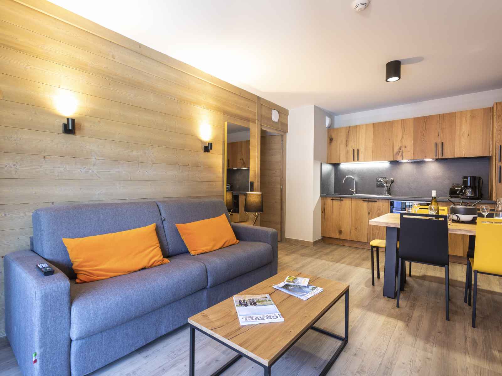 Cuisine ouverte avec espace repas avec table à manger et chaises