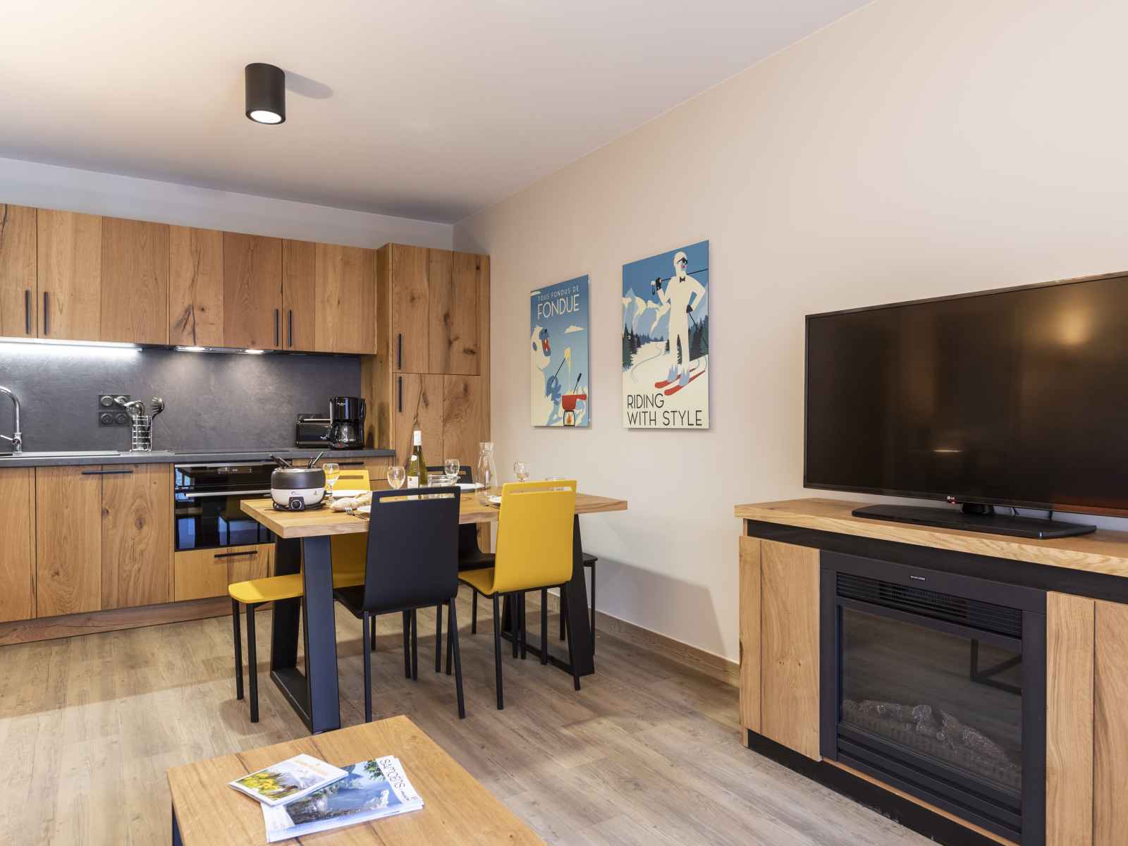 Cuisine ouverte avec espace repas avec table à manger et chaises