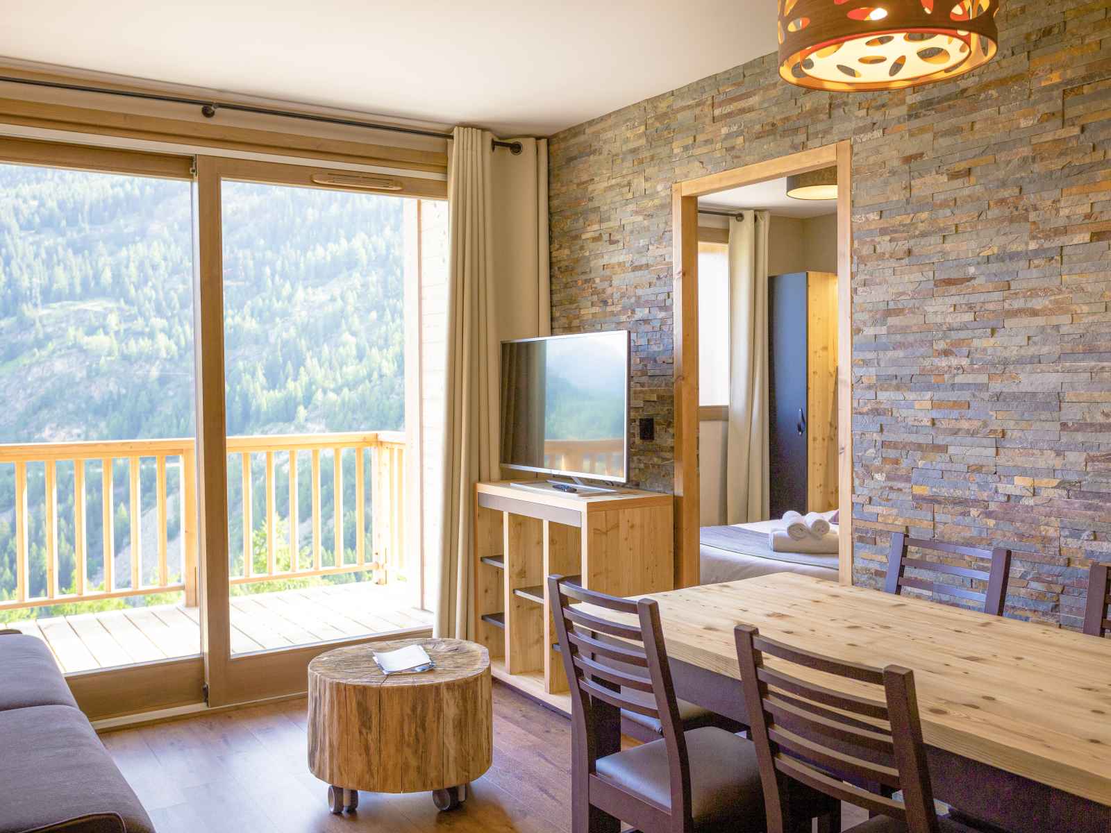 Séjour avec canapé lit convertible pour 2 personnes, table basse, TV, balcon ou terrasse