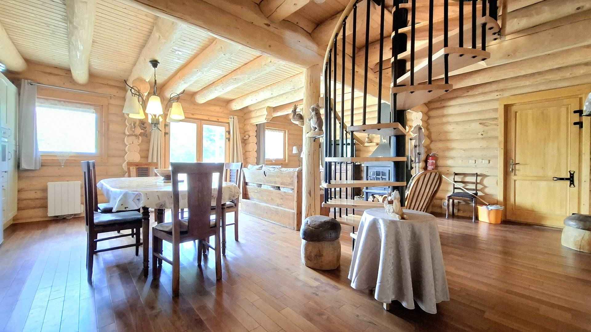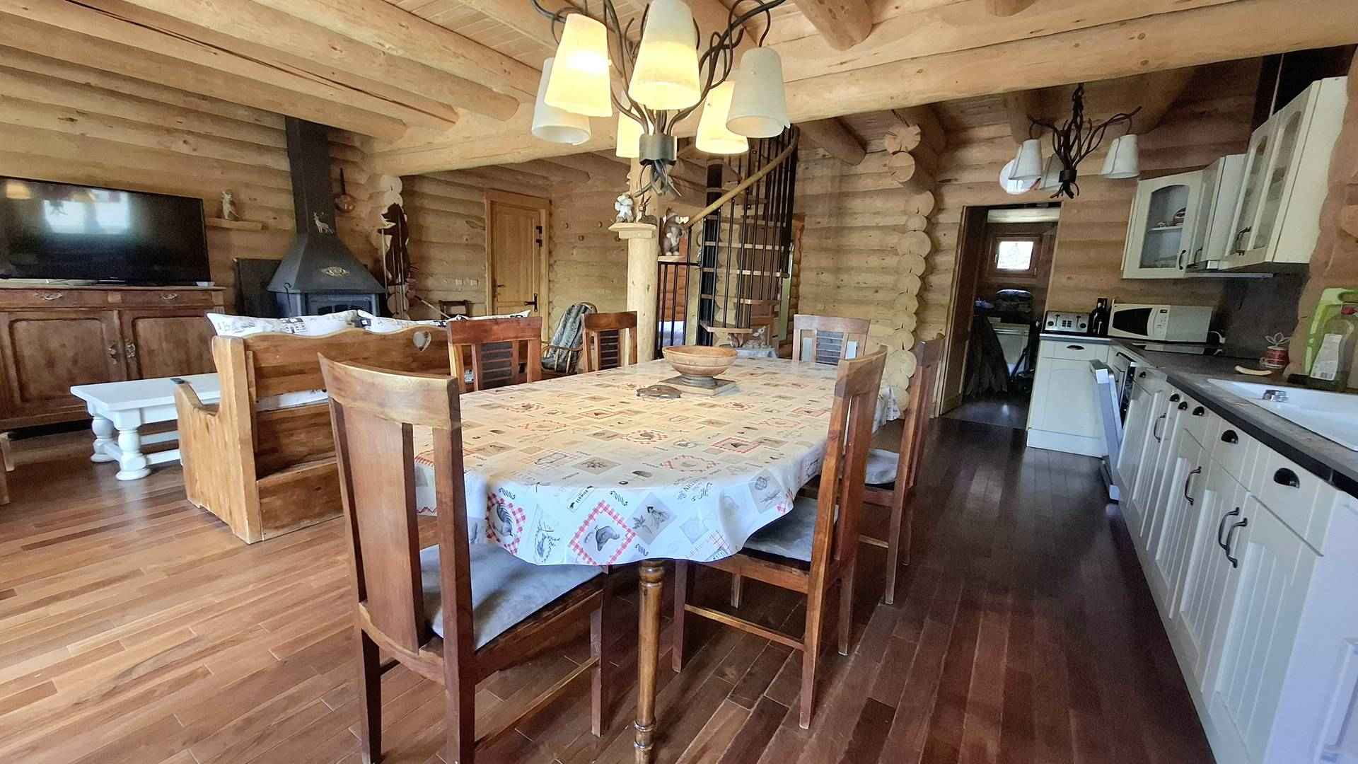 Ce chalet se compose, au rez-de-chaussée, d’un espace séjour convivial avec une cuisine ouverte équipée d’une plaque vitrocéramique 3 feux, d'un four, d'un micro-onde ainsi que tout le nécessaire pour cuisiner.