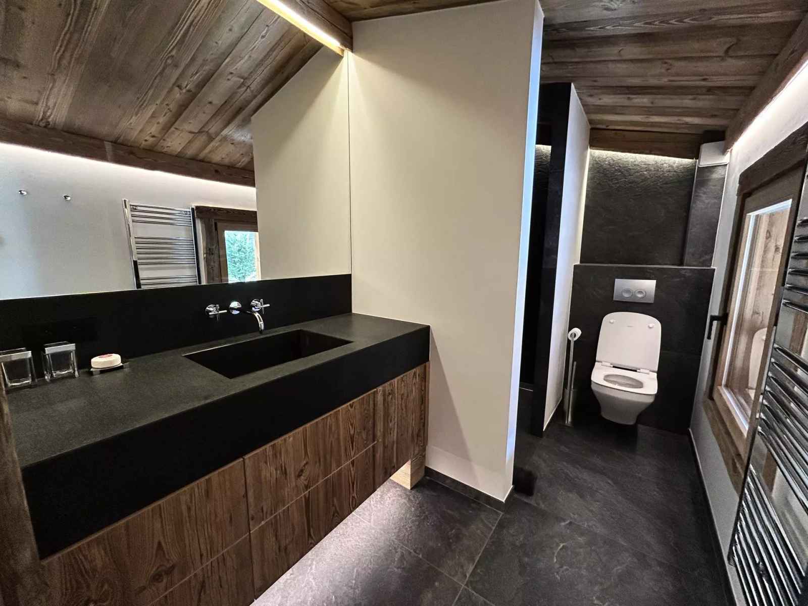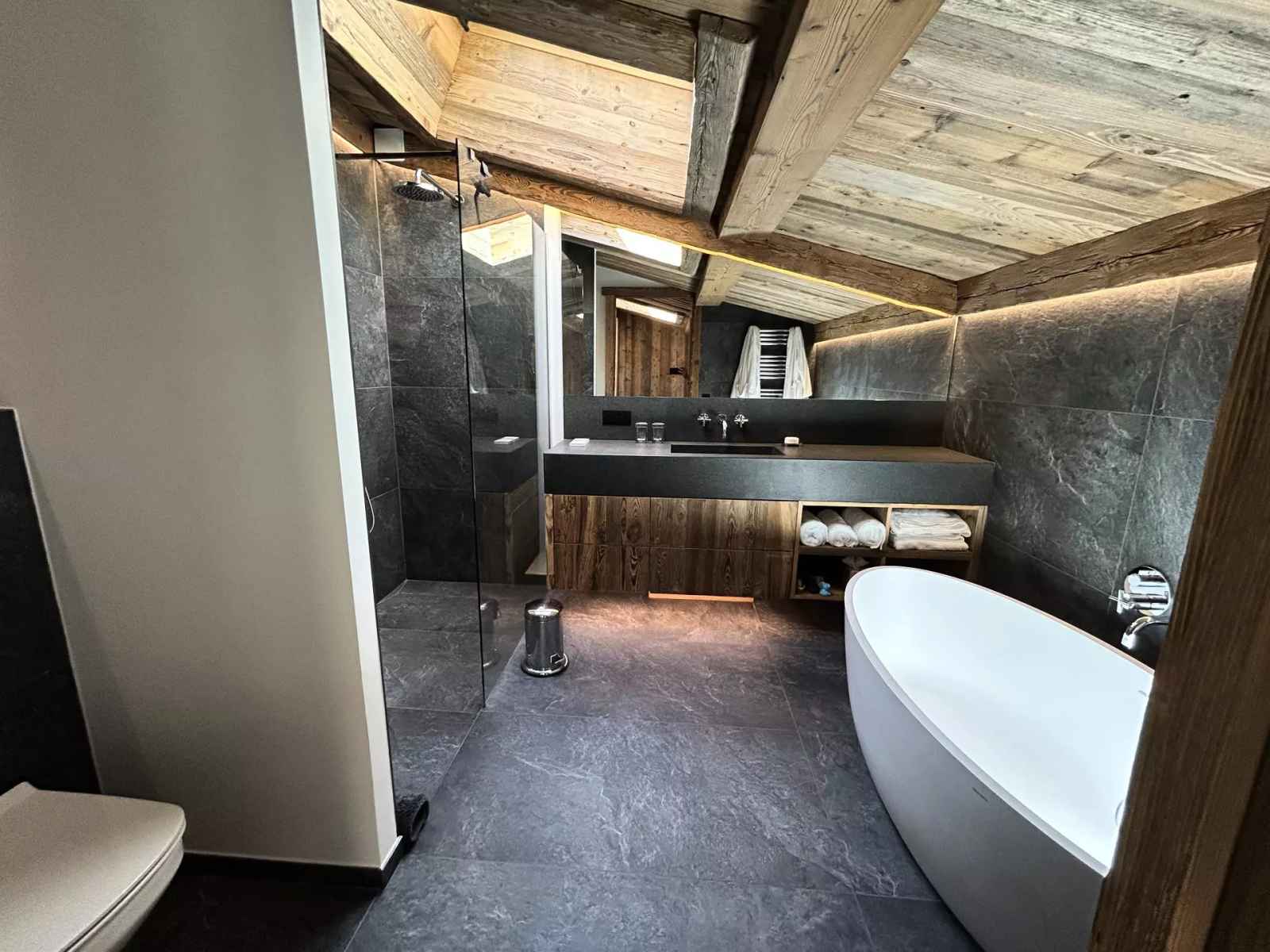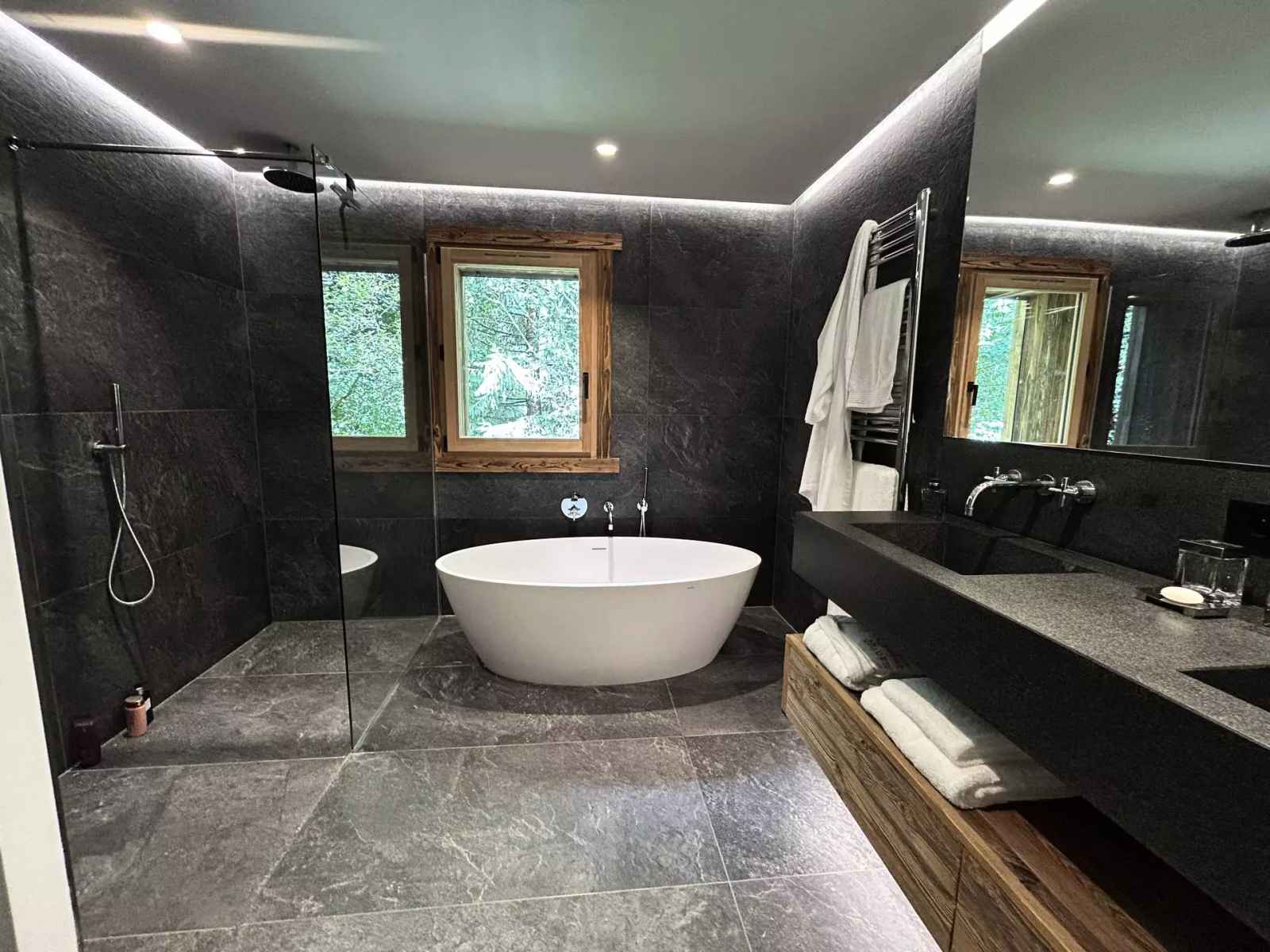 - Une chambre master avec un lit double (160x200), TV, bureau, dressing en suite avec une salle de bains équipée d'une baignoire, d'une douche, double vasque et WC.
