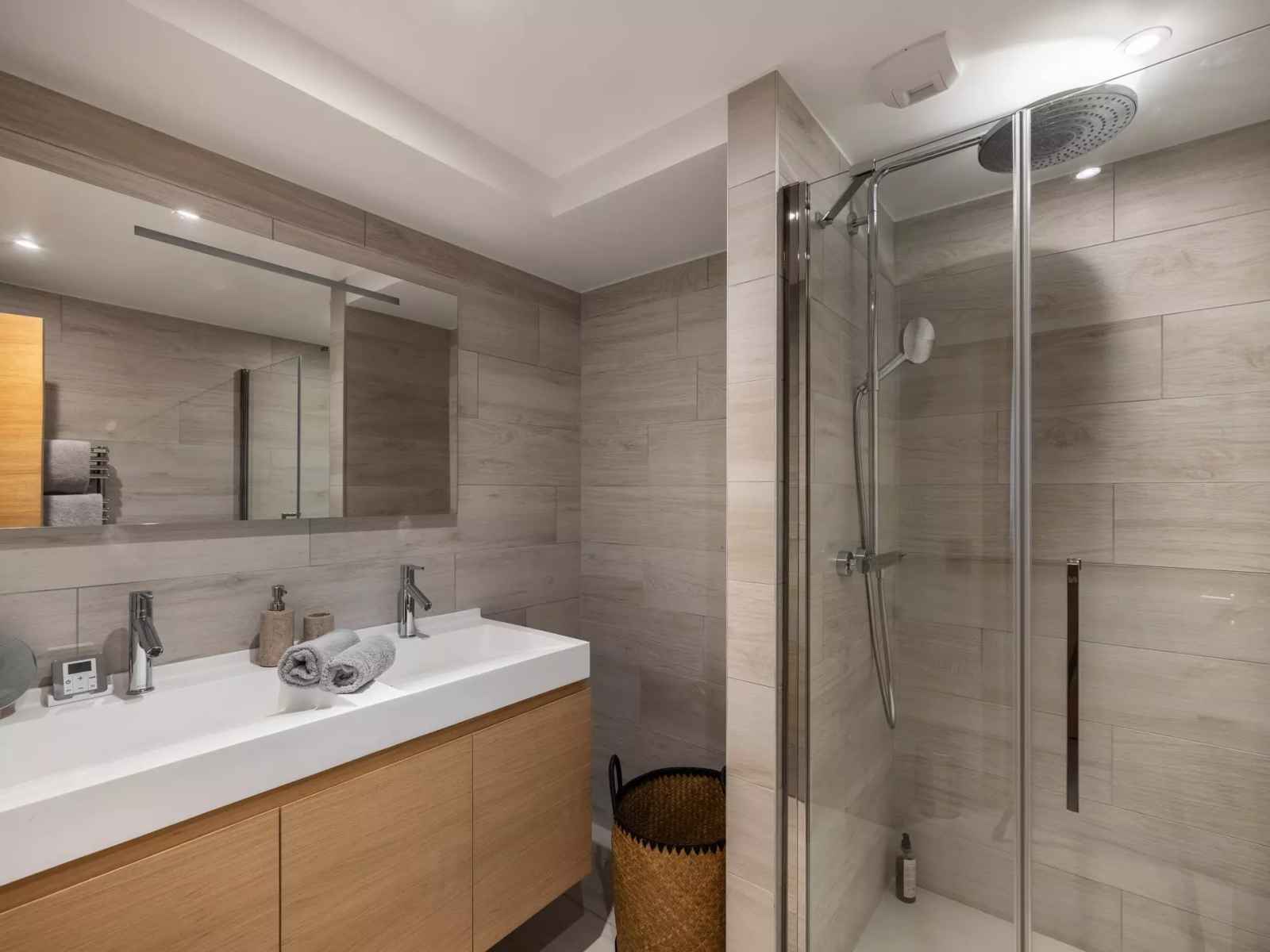 - Salle de douche indépendante avec douche, sèche-serviettes, double vasques