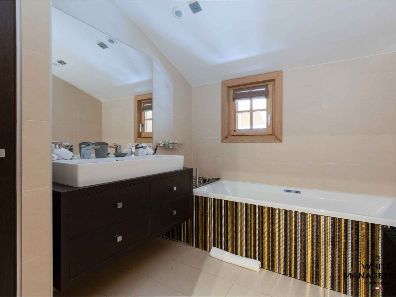 1 salle de bain indépendante avec baignoire, double vasque et WC