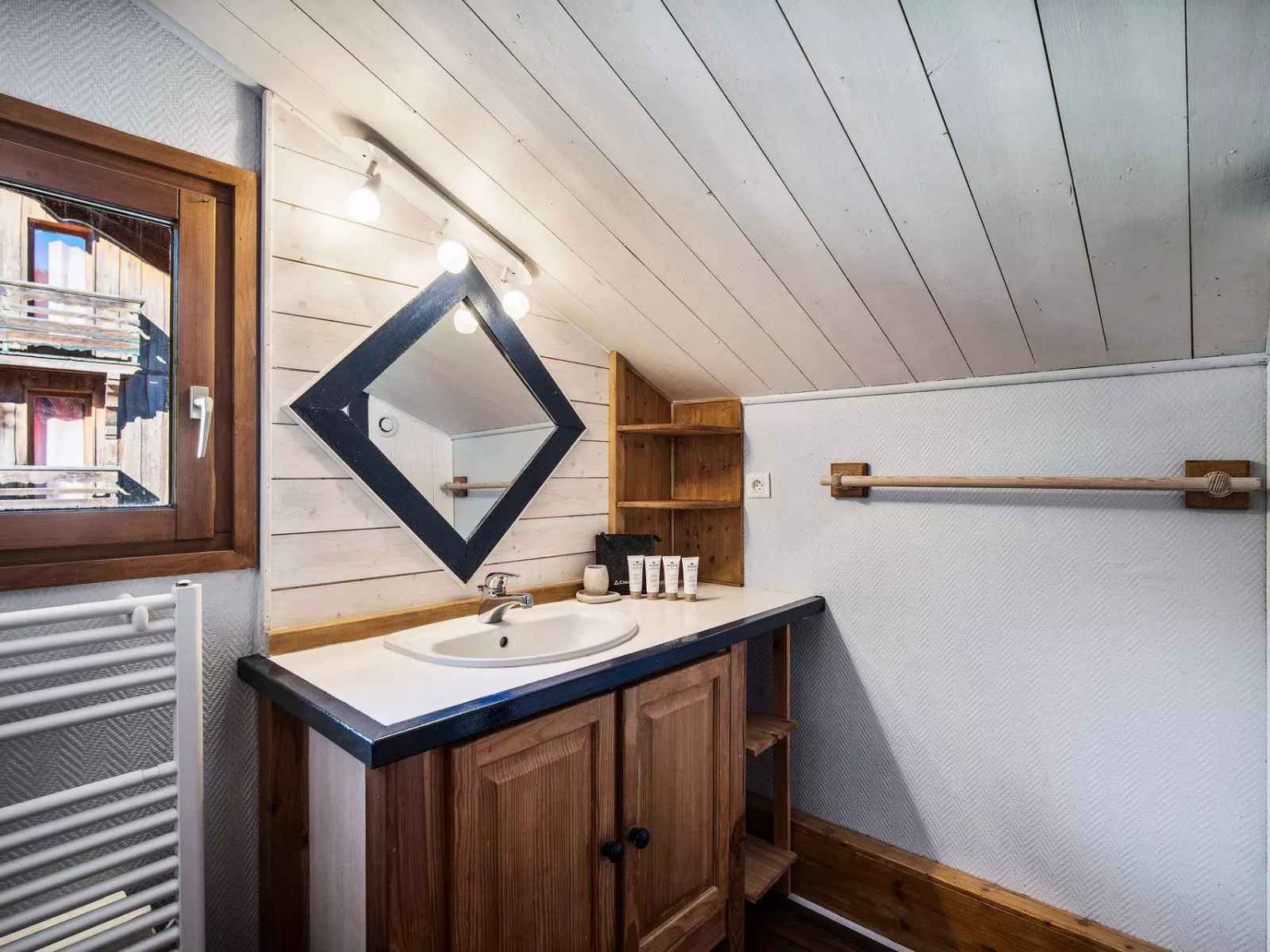 - 1 salle de douche avec simple vasque et sèches serviette,