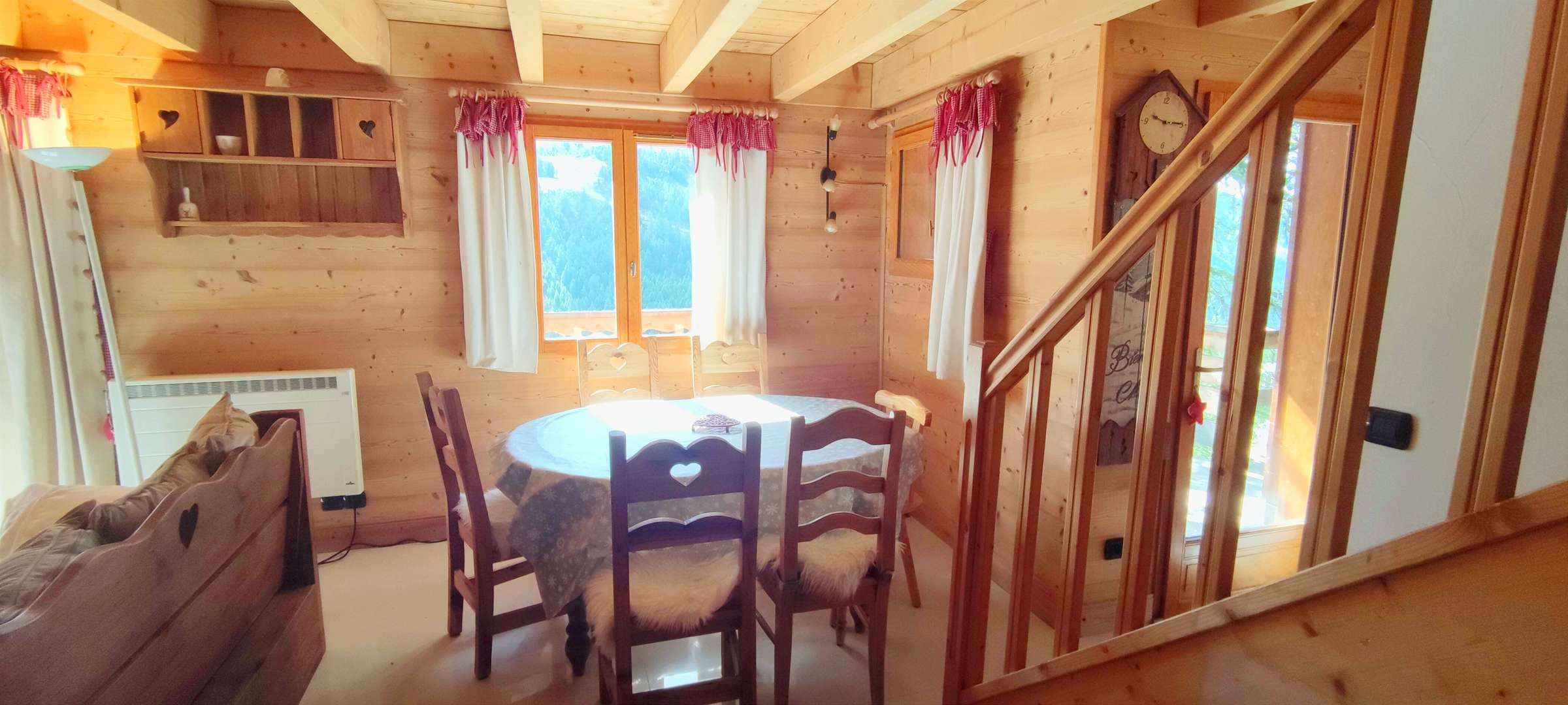 Chalet joliment décoré de 60m² avec cuisine américaine au rez-de-chaussée , une salle d’eau et WC, grande terrasses équipée vue dégagée sur les montagne, orienté Sud. A l’étage, WC indépendant, 1 salle de bain avec baignoire et les chambres.