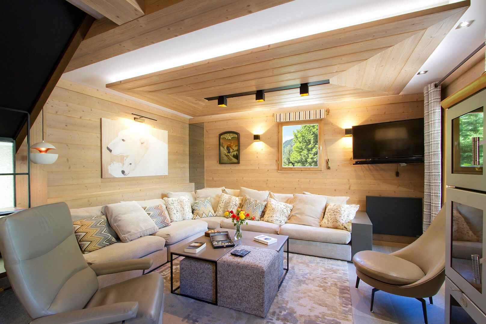 130m2, séjour avec poêle à bois, télévision à écran plat