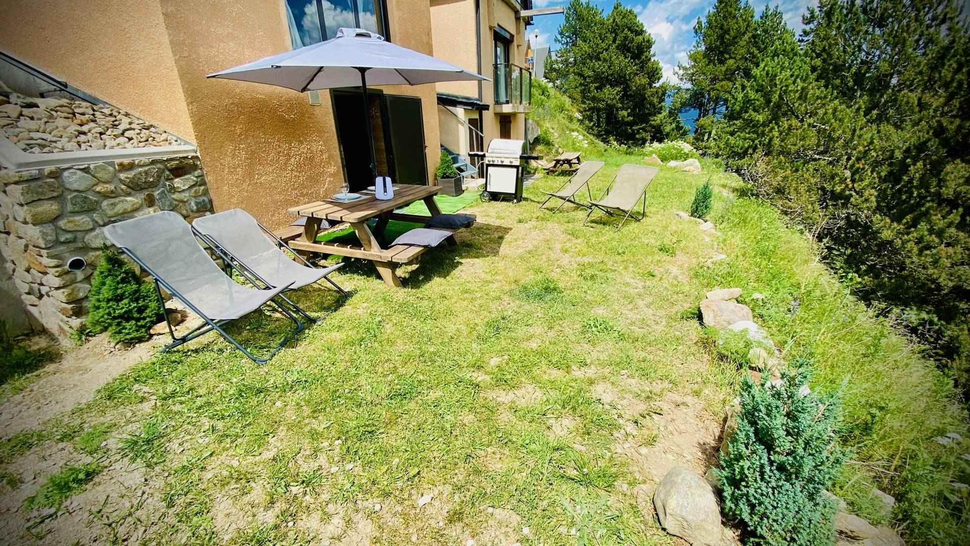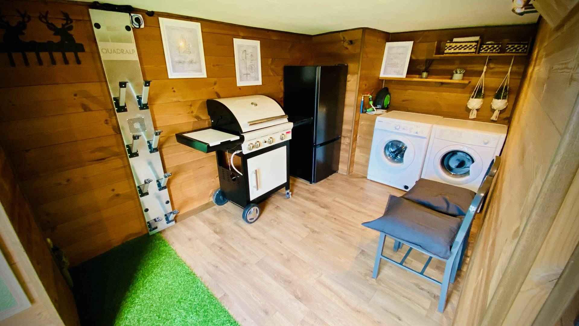 Au niveau du jardin, une grande pièce accessible par l’extérieur avec un espace spa avec un agréable jacuzzi. La pièce est aussi aménagée pour le rangement des skis, chaussures, vélos, etc. Elle dispose également d’un chauffe-chaussures. Ce niveau abrite aussi la buanderie, avec lave-linge et sèche-linge, ainsi qu’un deuxième réfrigérateur avec congélateur pour plus de confort durant votre séjour. Par beau temps, vous pourrez profiter du jardin avec une table de pique-nique et un salon extérieur, ainsi qu’un barbecue au gaz pour des grillades.
