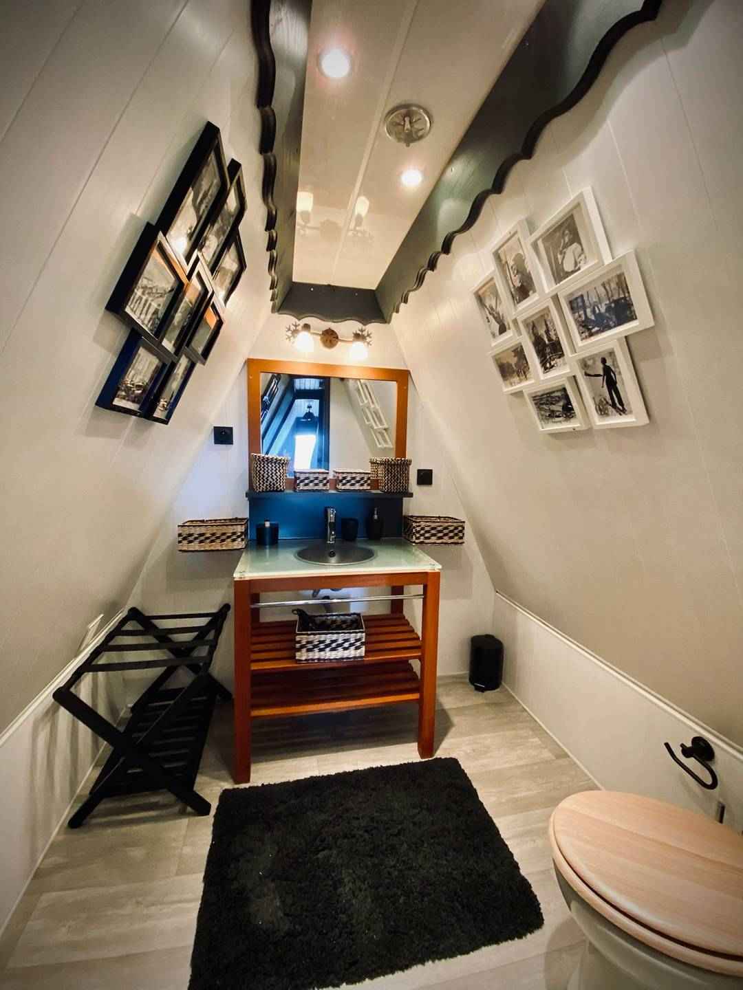 À l’étage, vous découvrirez une chambre mansardée avec deux lits jumeaux de 90 cm. Elle est équipée d’un placard et d’un porte-valise. Un espace bibliothèque, avec des livres pour tous les âges, est également à votre disposition. Vous trouverez aussi un point d’eau avec un lavabo et des WC à ce niveau.