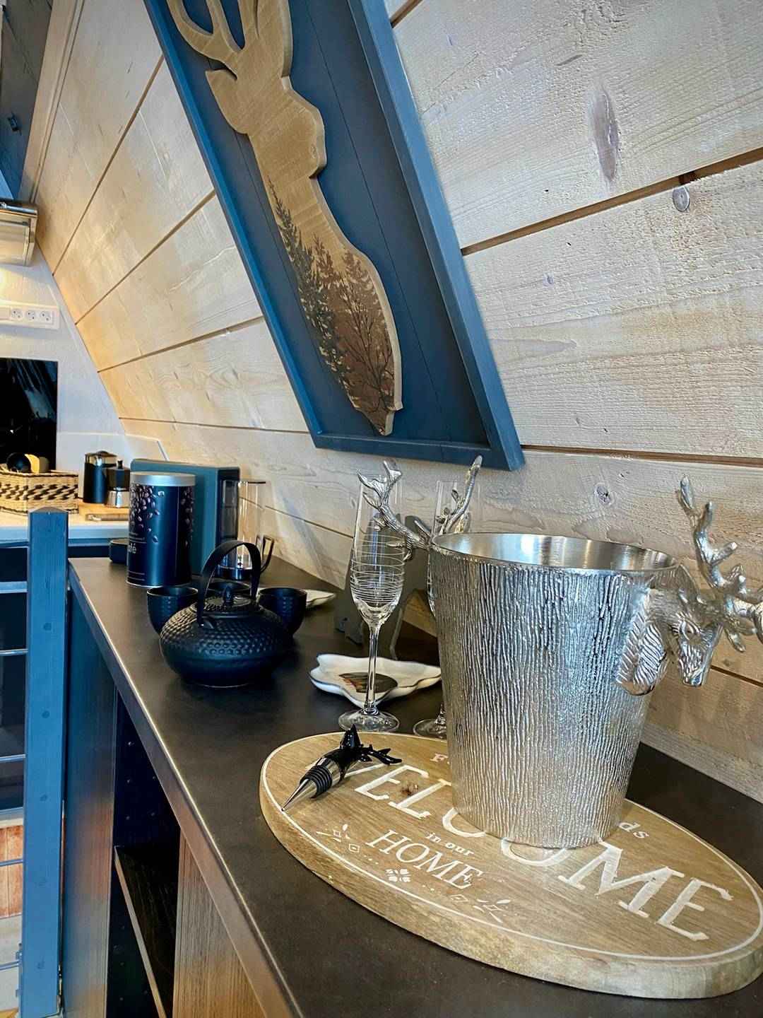 équipée avec four, micro-ondes, lave-vaisselle, réfrigérateur et divers ustensiles, dont une cafetière Nespresso, un appareil à raclette, à fondue, une crépière, etc. La grande télévision dispose d'une box TV et l’accès Wi-Fi est disponible dans tout le chalet.