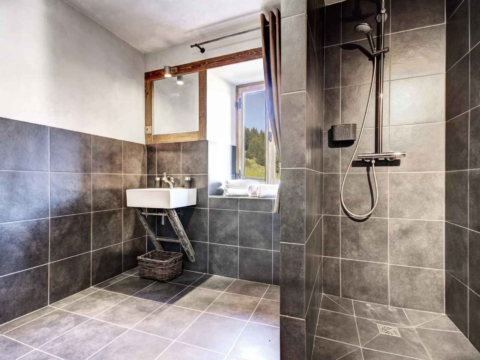 - Deux chambres mansardées avec lit double (160×200 cm), chacune avec douche et lavabo