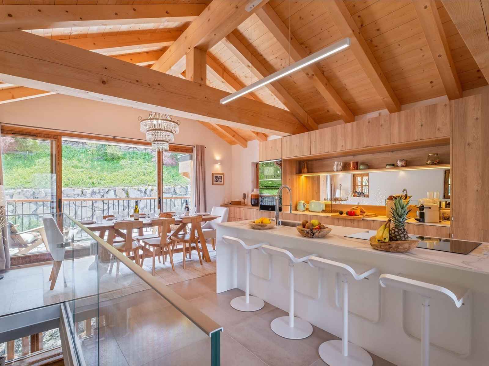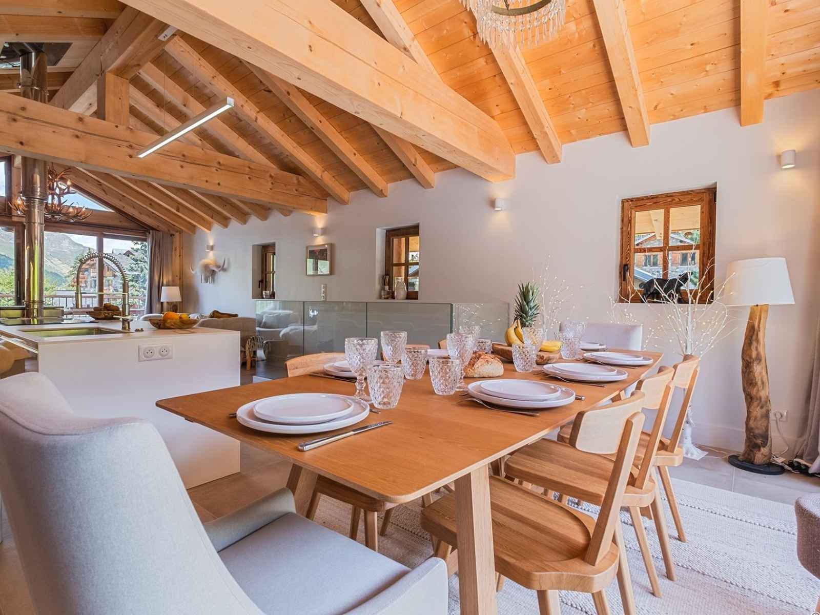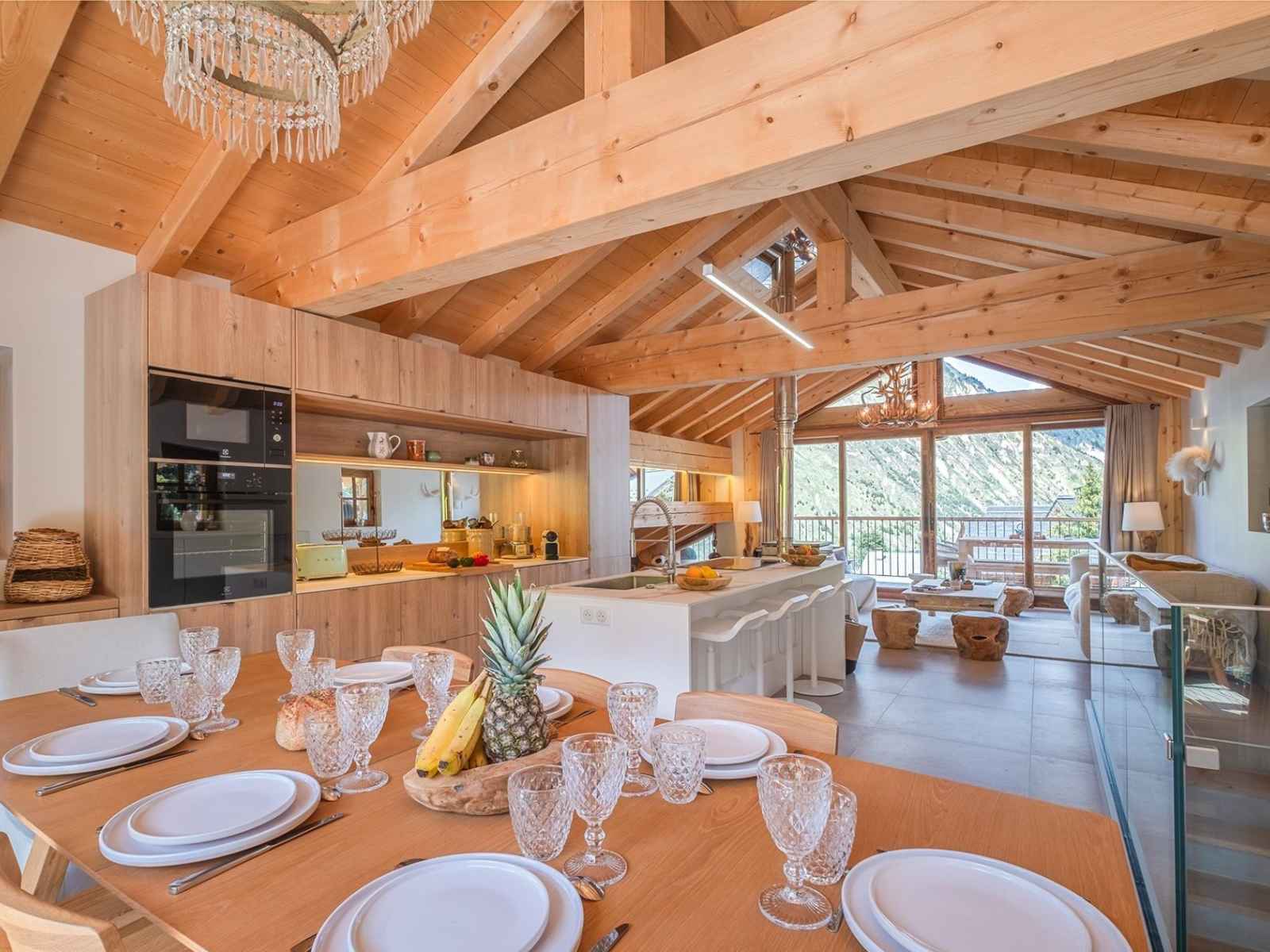 cuisine entièrement équipée (four, micro-ondes, lave-vaisselle, réfrigérateur, congélateur, appareil à raclette, plaque induction, cafetière à capsules, vaisselle 24 couverts)