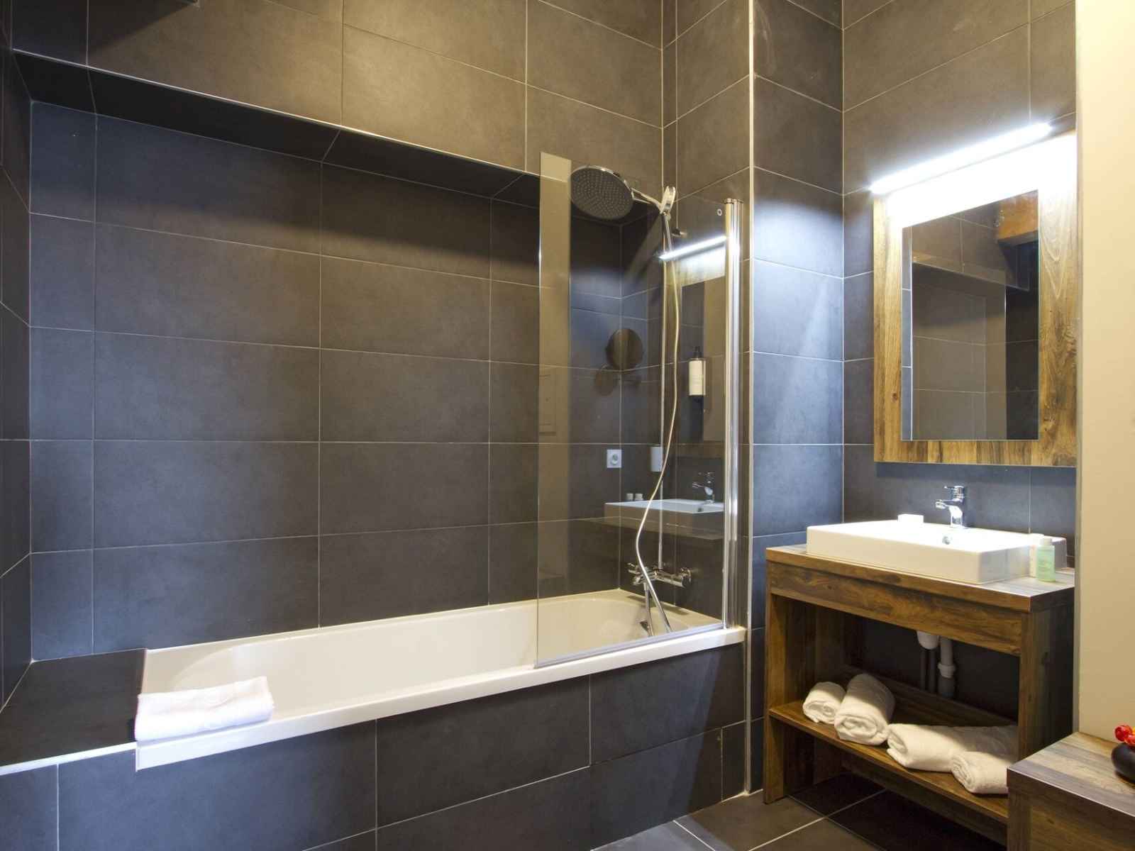 1 salle de bain avec baignoire, sèche-serviettes