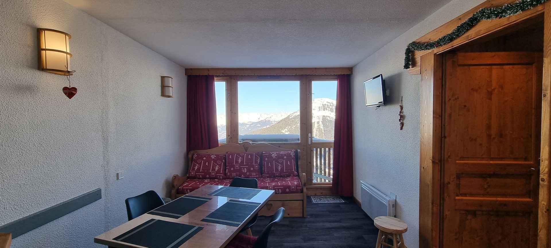 3 pièces 6 pers, 39m2, expo sud, terrasse , vue très dégagée sur la station et montagne, 4ème étage avec ascenseur. cuisine américaine : 4 plaques vitro-céramiques, réfrigérateur, four multi-fonctions, l-v - séjour : coin repas, 2 lits gigognes 1 pers, tv - chambre 1 : 2 lits 1