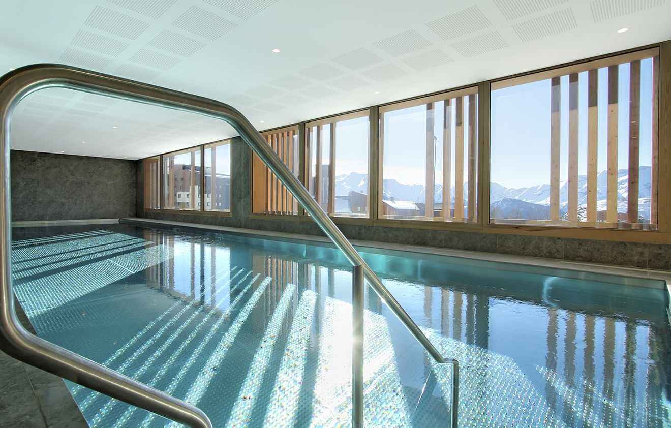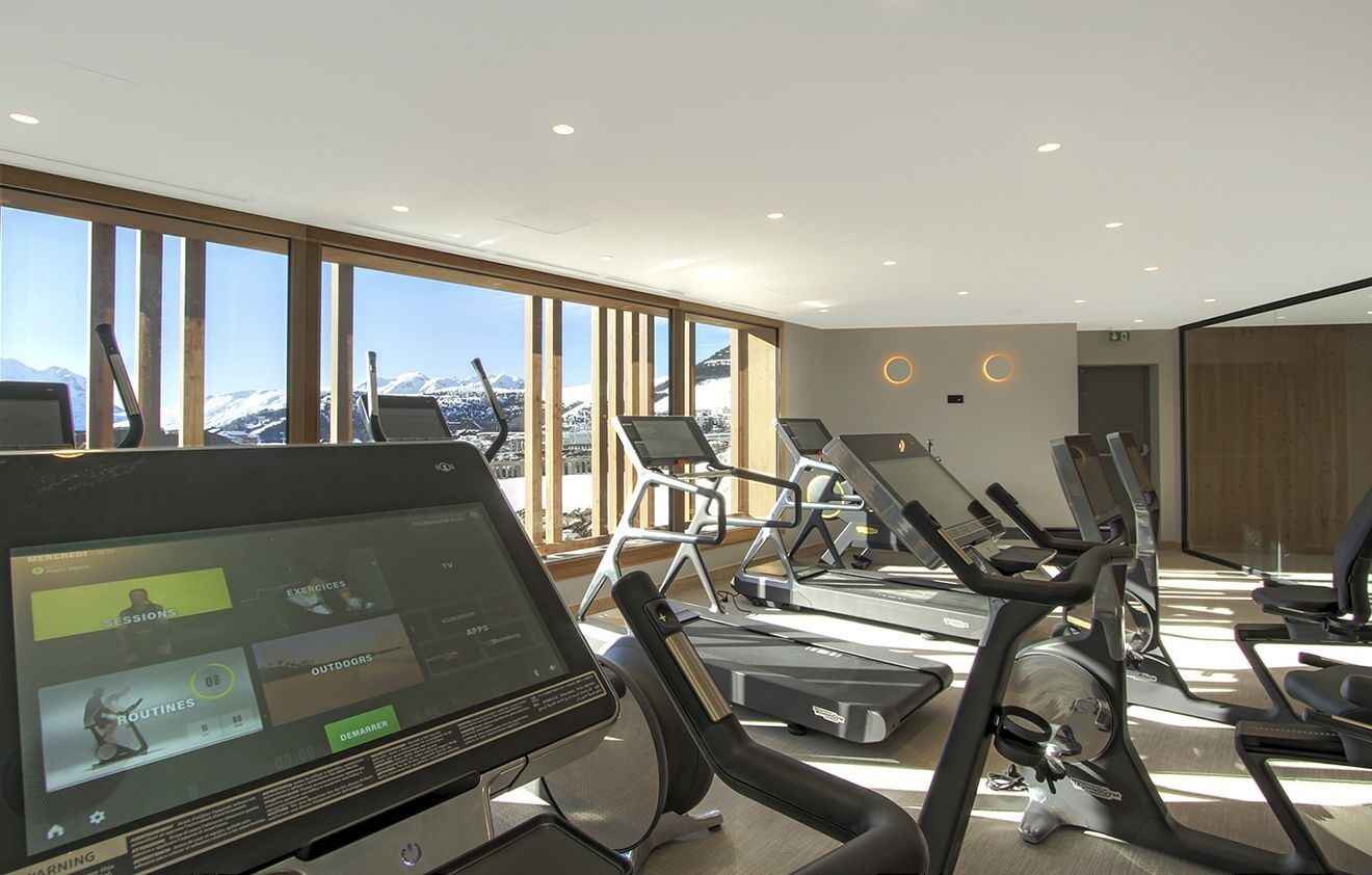 • salle de sport et piscine couverte avec vue sur les sommets