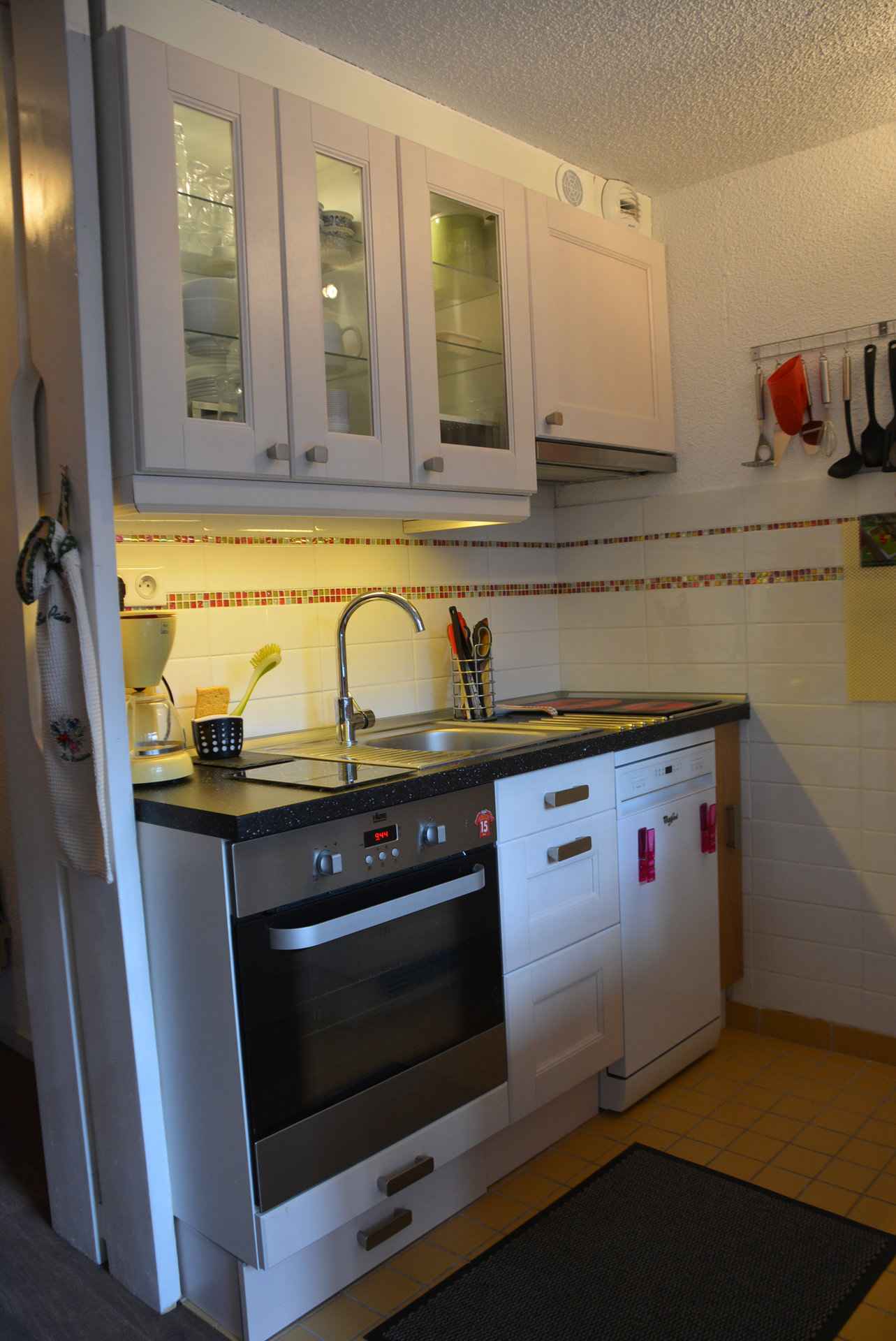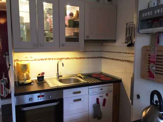 chambre semi-fermée avec 2 lits simples. Le couchage en hauteur ne convient pas aux enfants de moins de 6 ans. La salle de bain avec WC est à l'étage et des toillettes indépendantes au RDC. La cuisine est équipée de deux plaques vitrocéramiques, d'un réfrigérateur, d'un lave-vaisselle, d'un four traditionnel, d'une cafetière électrique, d'un grille-pain et d'une bouilloire. Linge de lit, de bain et ménage fin de séjour en supplément. L'appartement est non-fumeur. Les animaux ne sont pas autorisés.