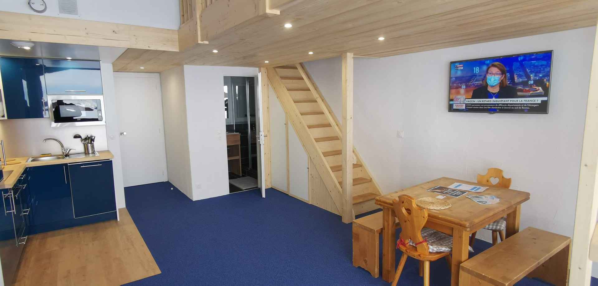 appartement rénové se compose d'une première mezzanine avec deux lits simples (80*200), d'une deuxème mezzanine avec un lit double 160*200 et un canapé convertible en 160 dans le