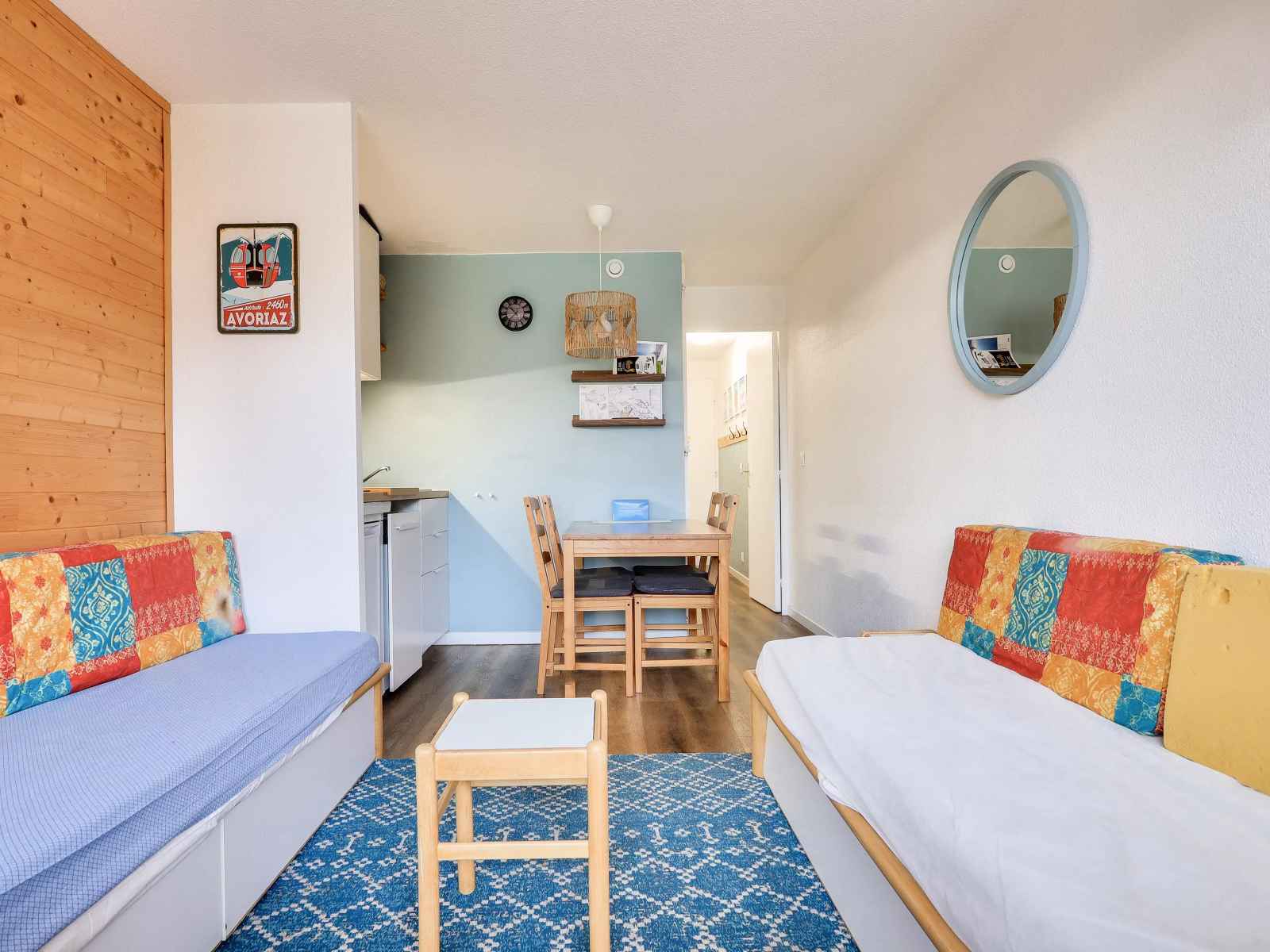 Équipements séjour : 2 lits-banquettes dont 1 avec 1 lit gigogne (recommandé pour les enfants). Côté repas : une table avec 4 chaises.