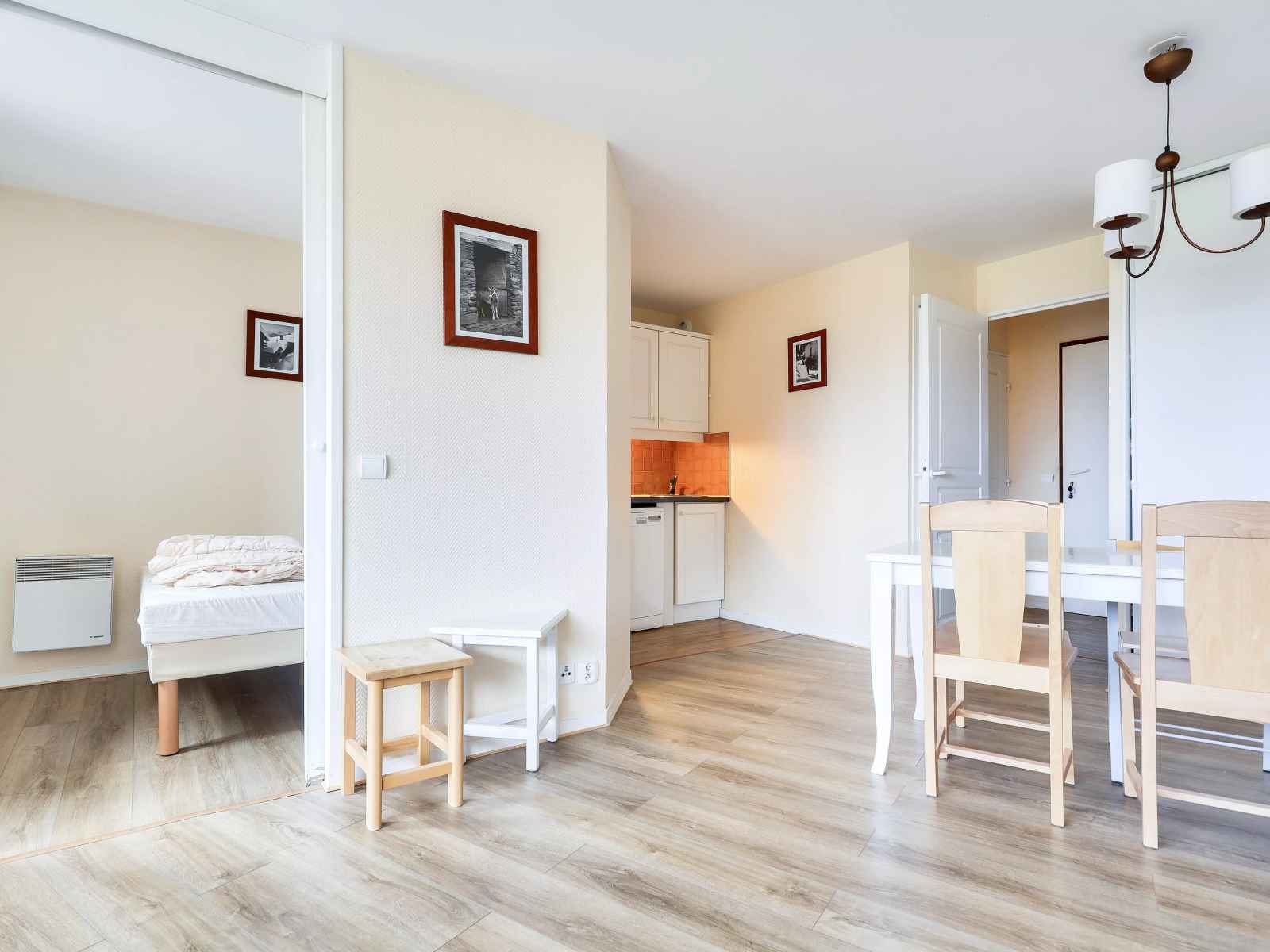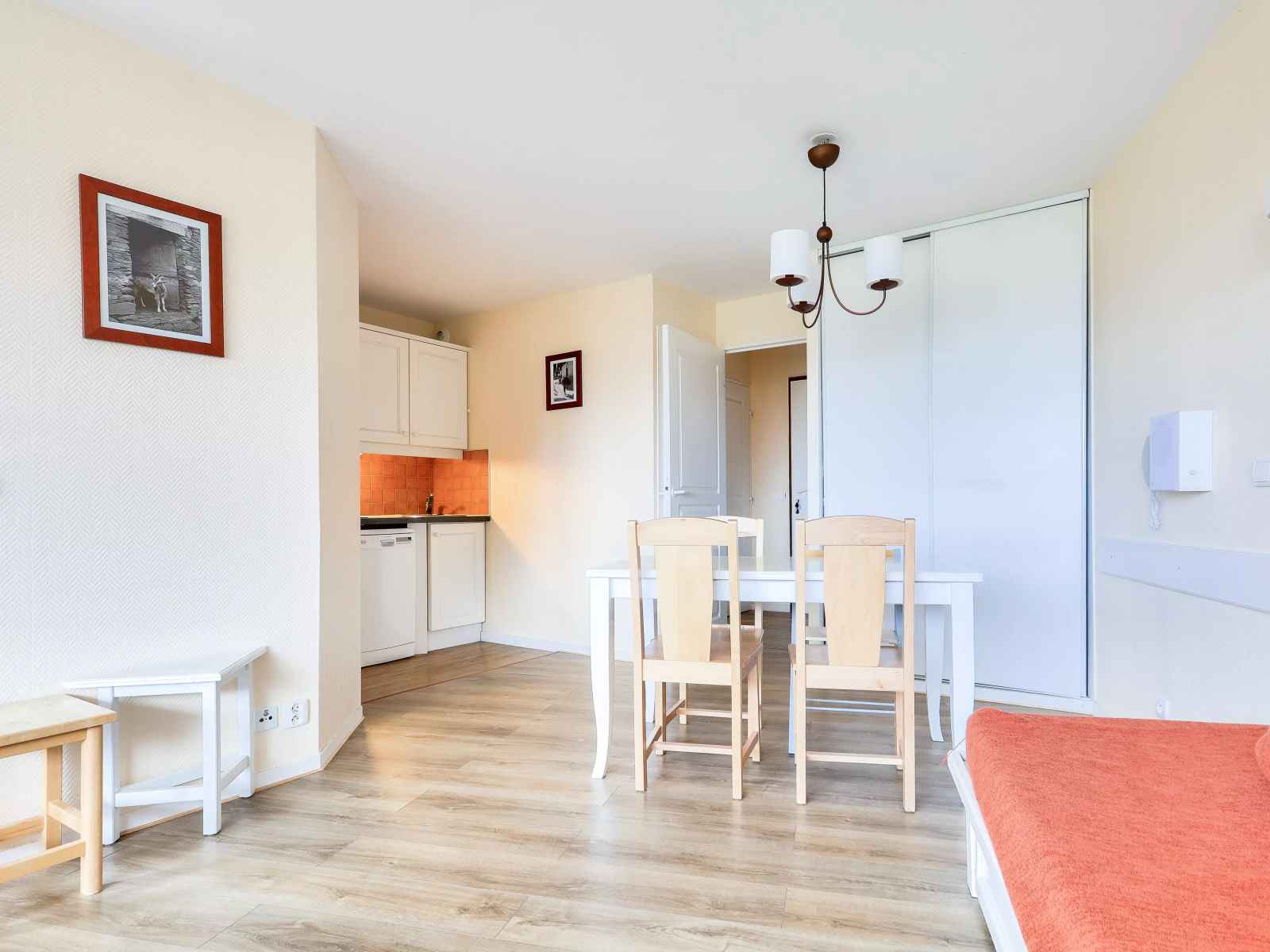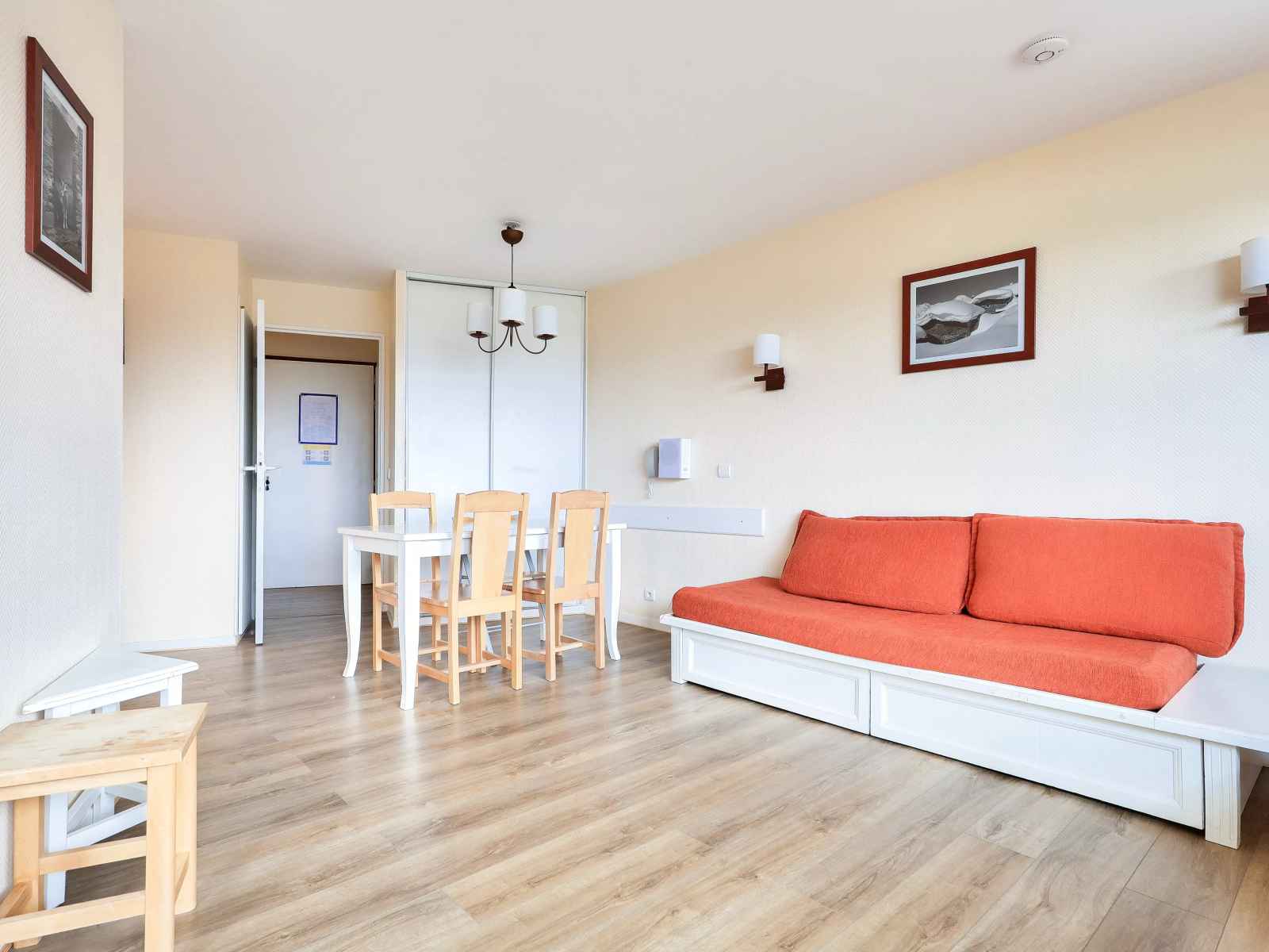 Équipements séjour : 1 canapé-lit + lit gigogne (3 couchages). côté repas : 1 table avec 4 chaises.