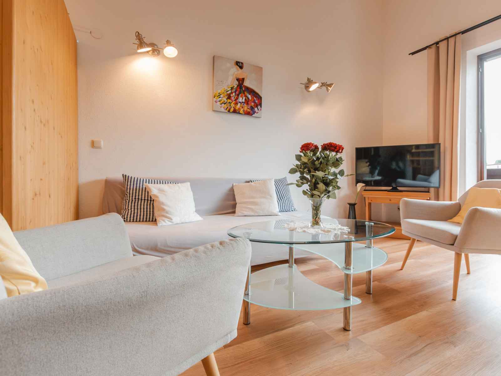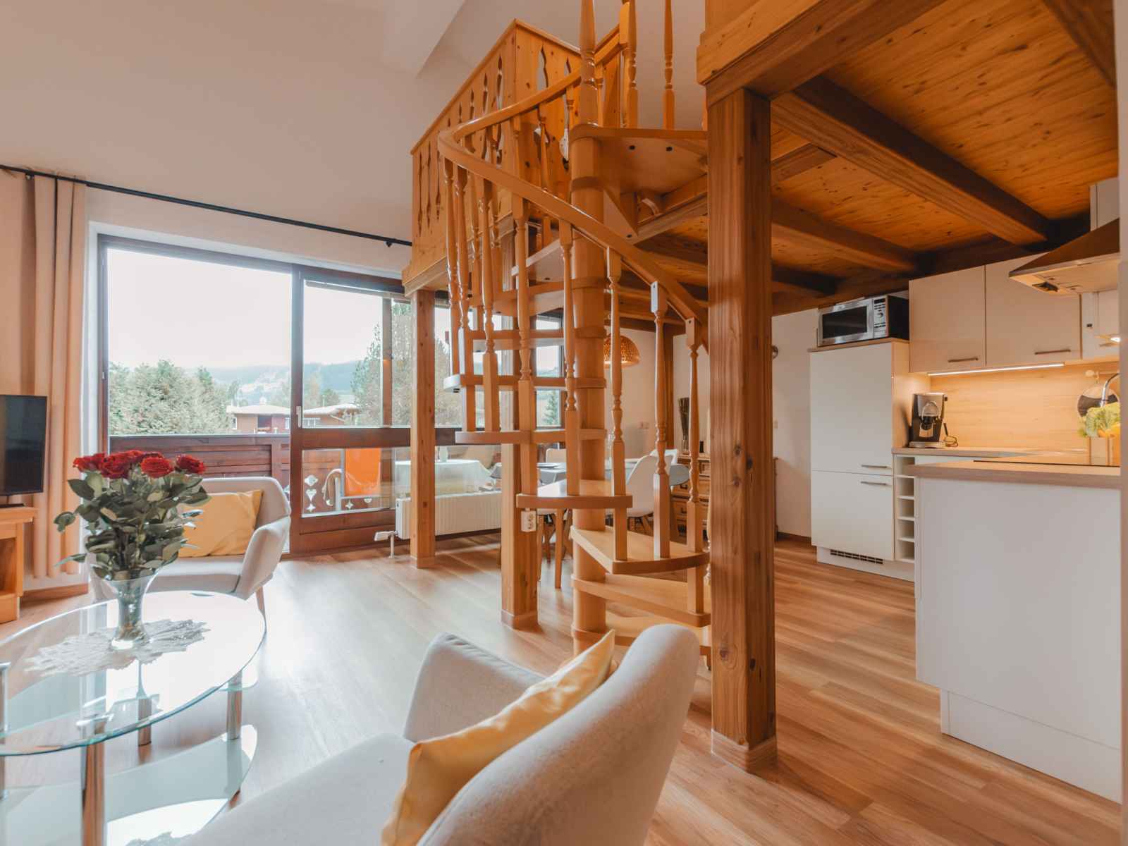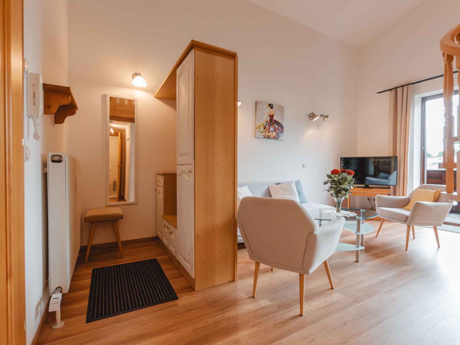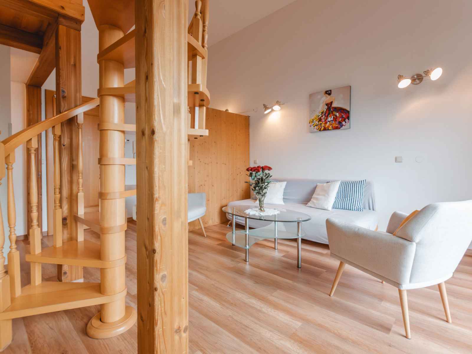 "anna-katharina" studio 53 m2 au 2ème étage. logement idéal pour 2 adultes + 2 enfants. spacieux et clair, aménagement très moderne et plaisant: entrée. galerie 17 m2, ouverte avec 1 lit double. séjour/salle à manger 36 m2 avec baie vitrée avec 1 divan-lit double, table pour les repas et tv (câblée) (écran plat). sortie sur le balcon.