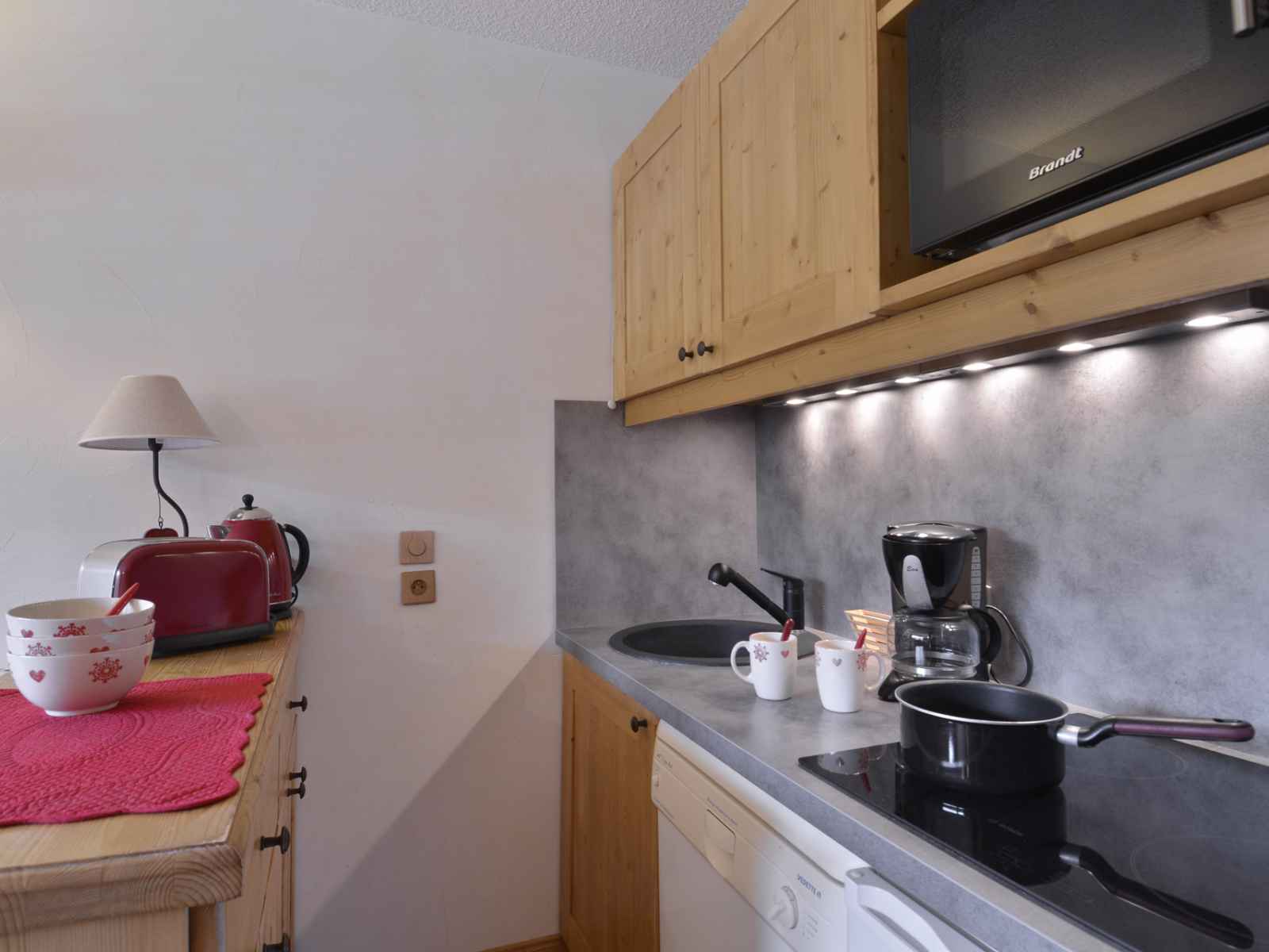 cuisine : ouverte avec un four mixte, 1 plaque vitro céramique 4 feux, un réfrigirateur et un lave-vaisselle