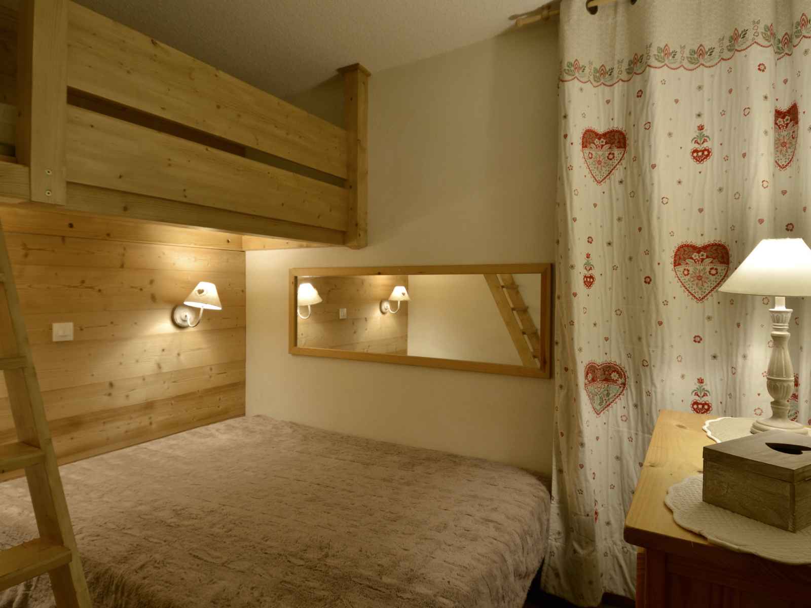 plat Chambre : 1 lit 2 personnes et 1 lit 1 personne en hauteur Coin cabine : 1 lit 1 personne rabatable Salle de bain : baignoire balnéo WC indépendants Draps et serviettes non fournis Equipé de couettes WIFI station payant Animaux non tolérés