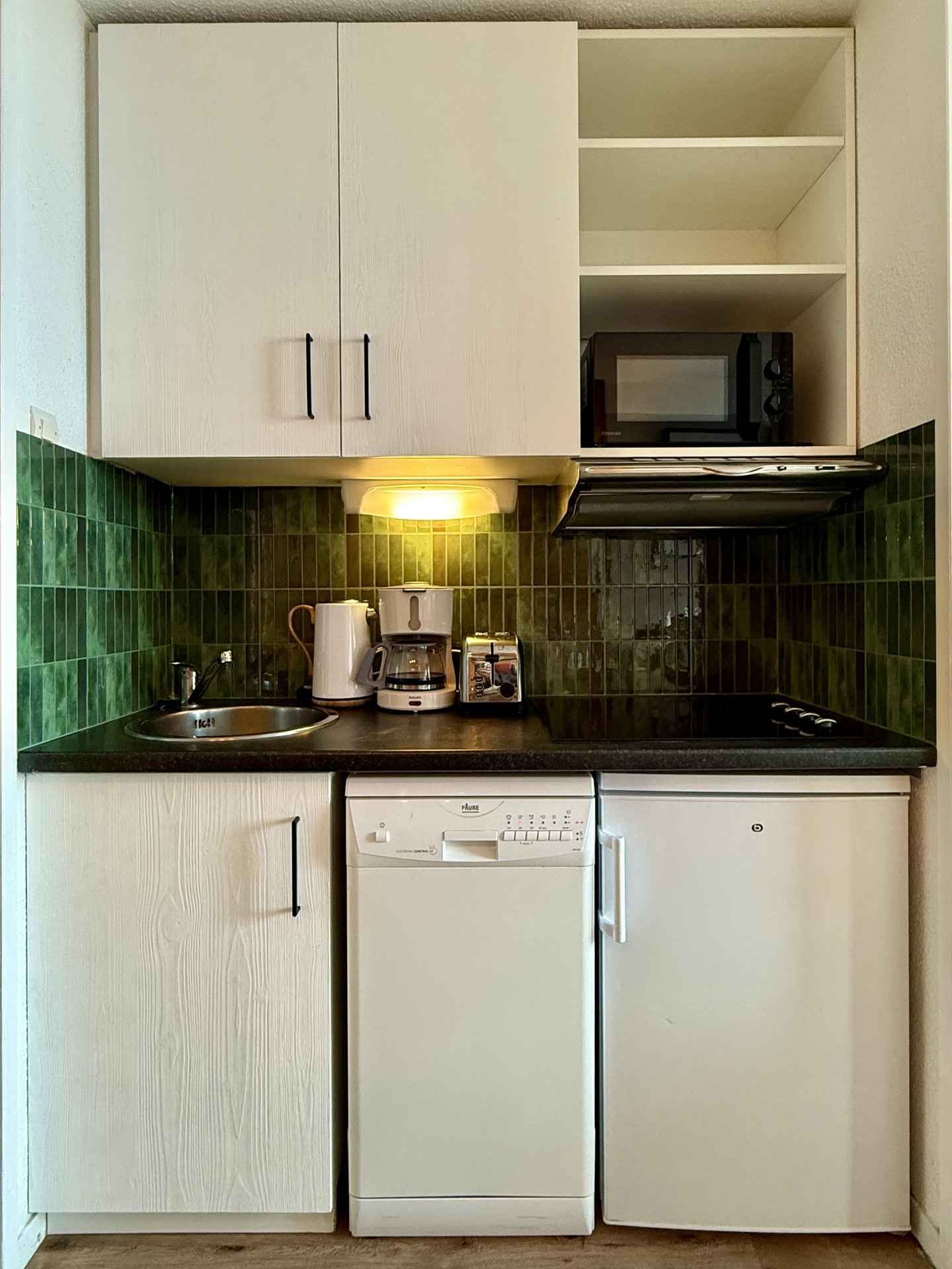 cuisine : ouverte sur le séjour avec 1 plaque vitro céramique 4 feux, un micro ondes grill, un lave vaisselle et un réfrigérateur