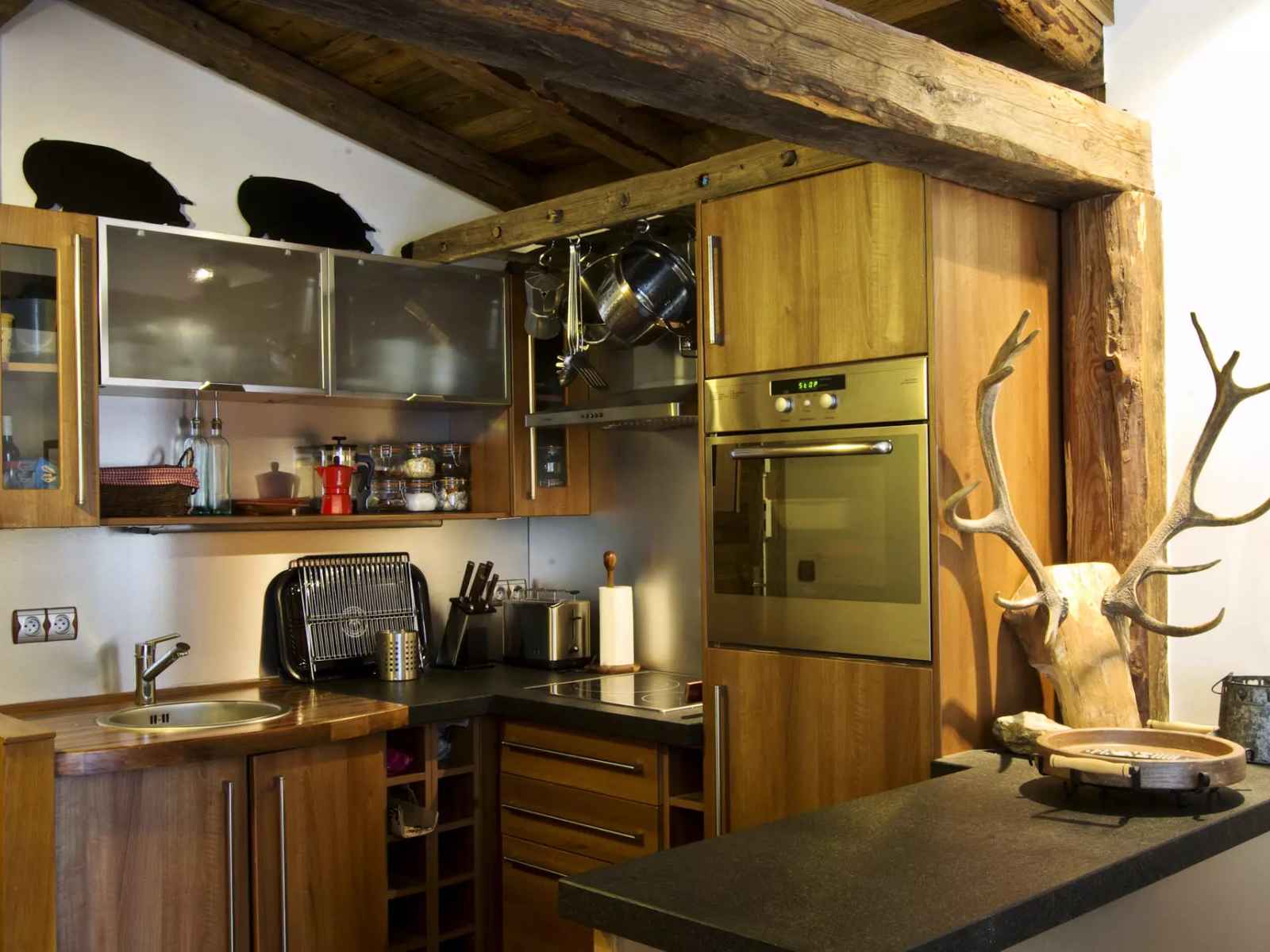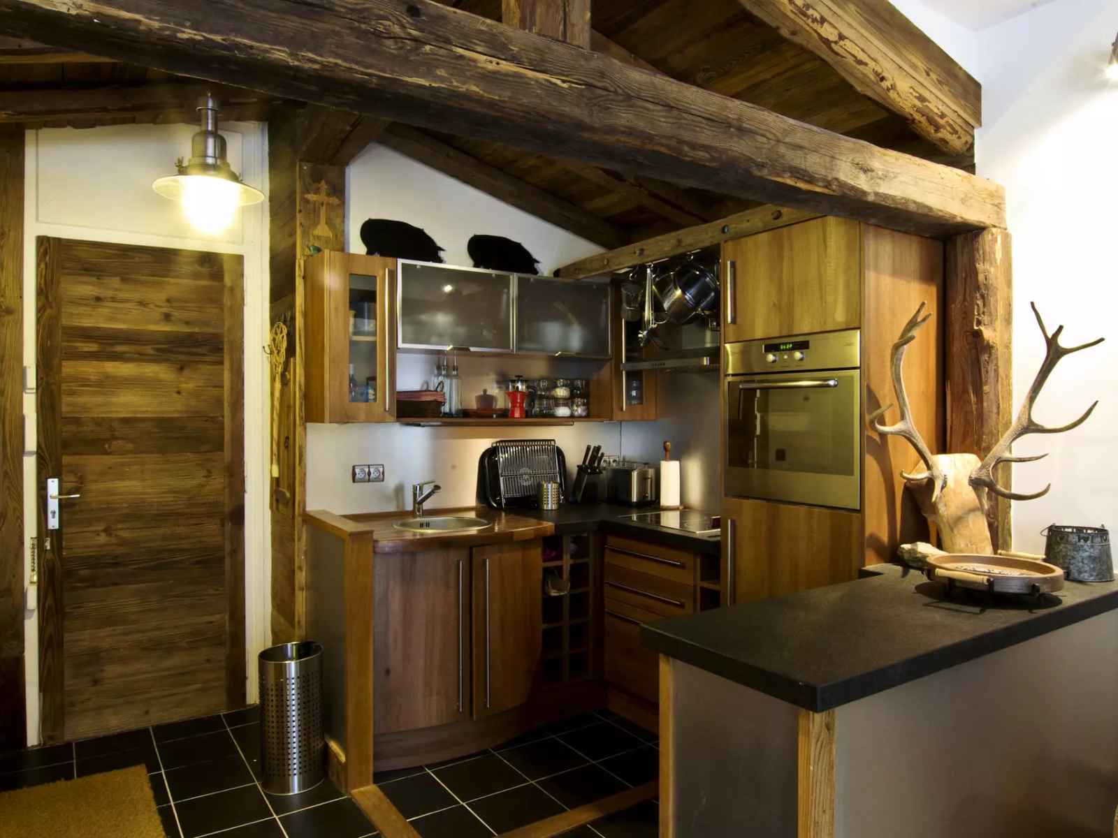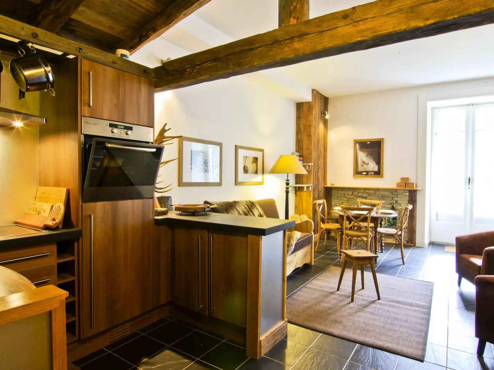équipée (four, réfrigérateur, plaques vitrocéramiques, lave-vaisselle et hotte, cafetière italienne, cafetière à piston, grille-pain, appareil à fondue)