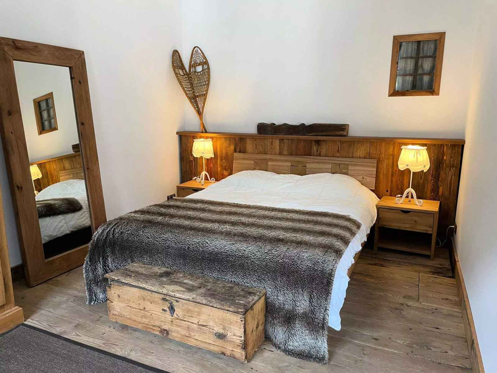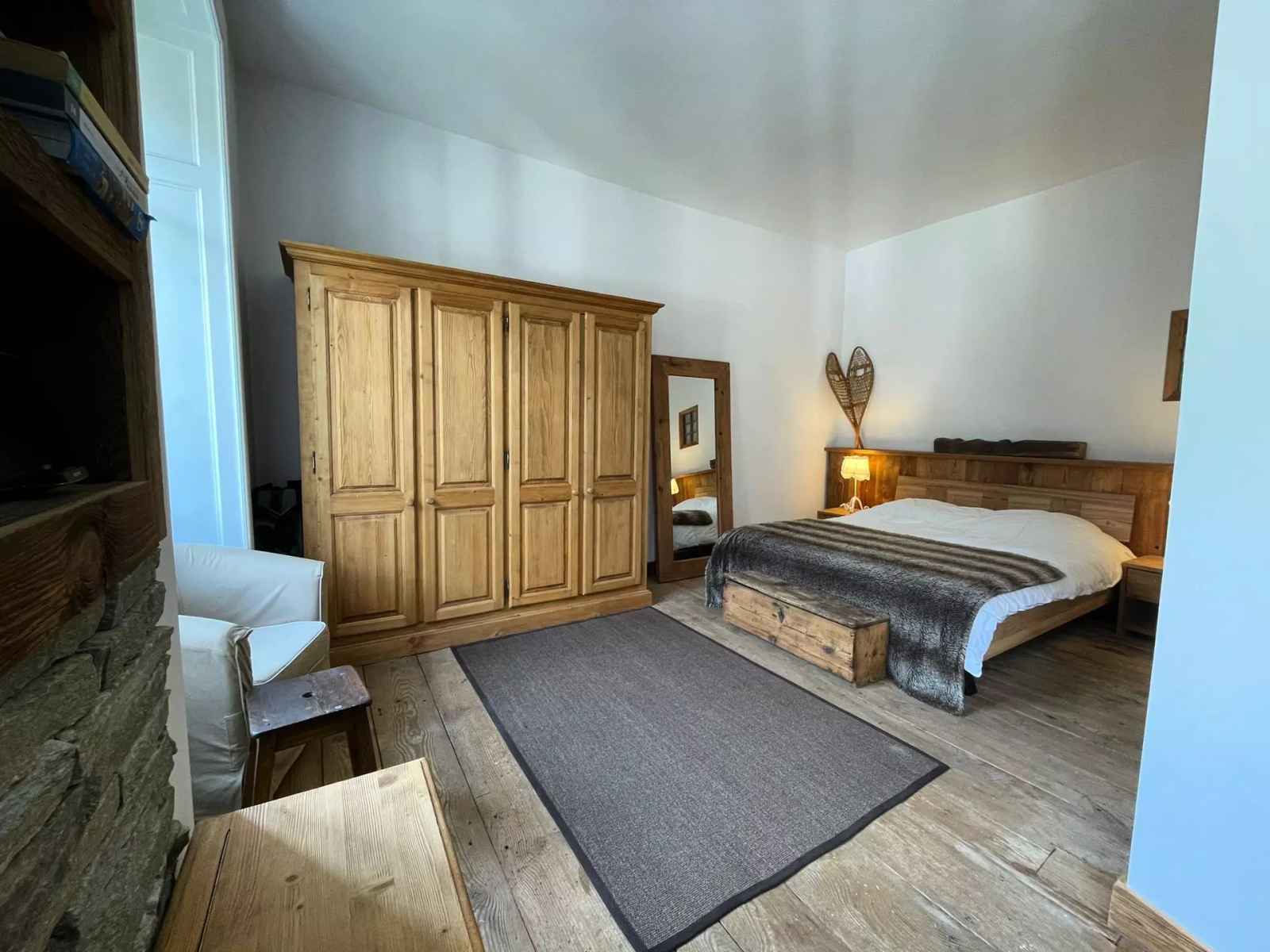 - Une grande chambre ouverte avec un lit double (160x190), balcon, vue sur la chaine du Mont Blanc