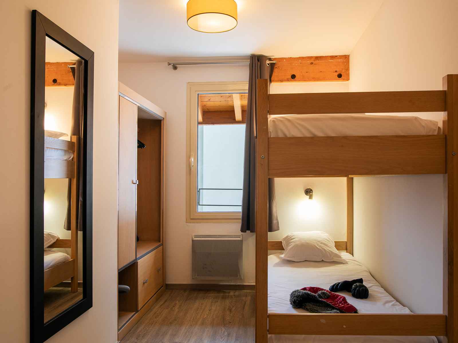 avec 1 lit de 140 ; un séjour avec 1 canapé lit gigogne et 1 banquette lit, une cuisine américaine et un coin repas, wc indépendant et salle de bain. Balcon avec vue sur le versant nord et les pistes.