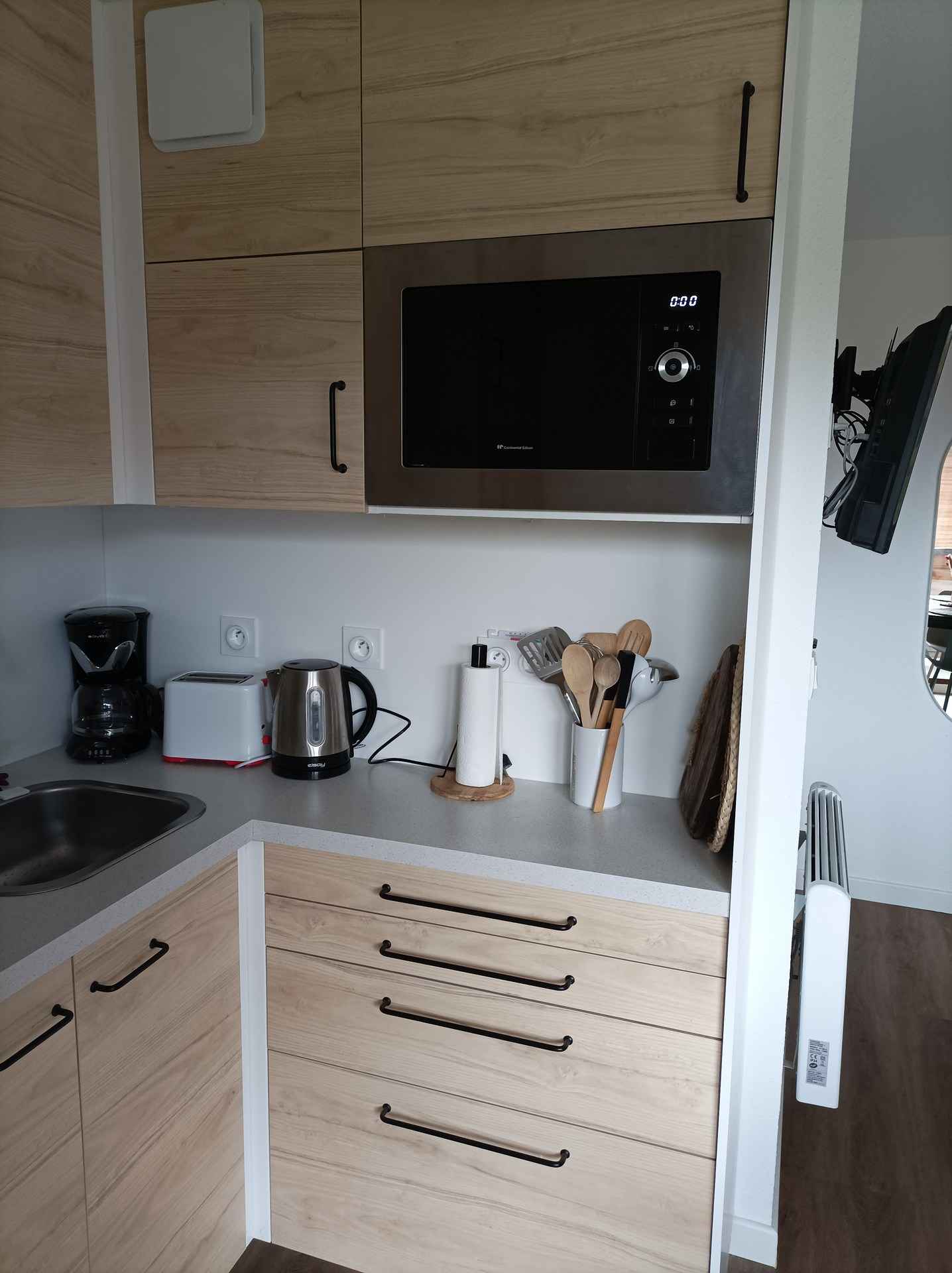 coin cuisine équipé avec plaques à induction, frigo congélateur, four, micro-ondes, lave-vaisselle, cafetière à filtre, grille-pain, nécessaire de vaisselle, aspirateur, lave-linge dans la salle