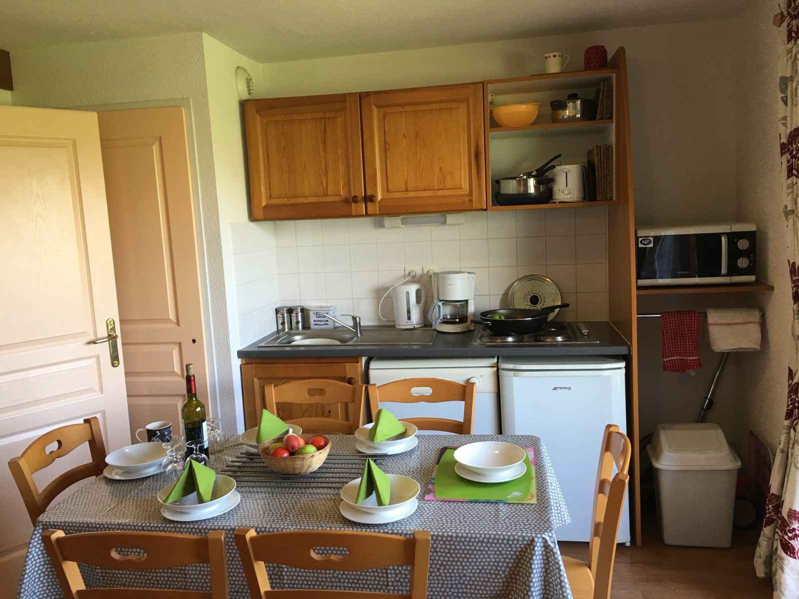 kitchenette entièrement équipée. lave vaisselle, micro-ondes, cafetière électrique.