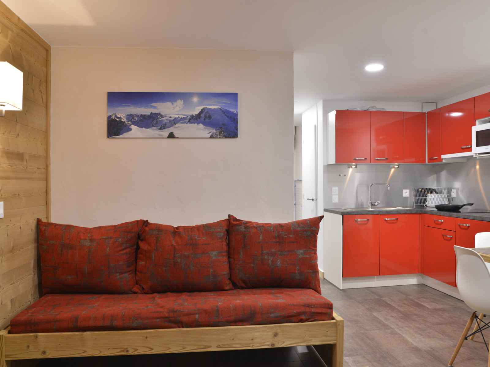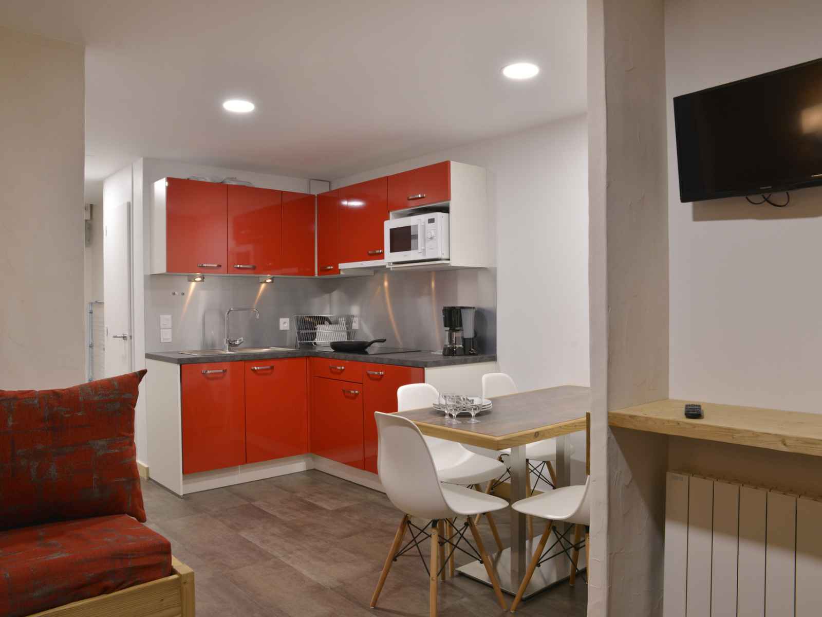 une plaque vitrocéramique 4 feux, un réfrigérateur et un lave-vaisselle Séjour : 2 lits 1 personne et 1 lit gigogne, 1 téléviseur écran plat Chambre : 1 lit 2 personnes Salle de bain : baignoire WC indépendant Casier à ski inclus dans la résidence Draps non fournis Equipé de couettes Serviettes non fournies Pas d'accès gratuit à la piscine Wifi station payant Animaux admis (30€ de supplément)
