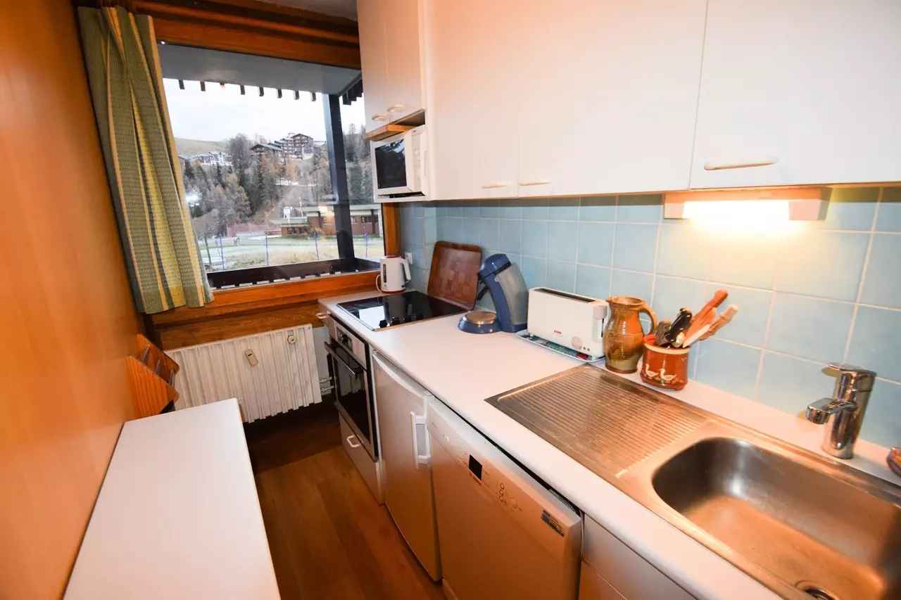 appt 2 pièces, 6 pers, 42m², exposé est, vue sur les pistes, avec balcon, 2ème étage ascenseur : niveau 0 - cuisine séparée 4 plaques halogènes, four, four micro-ondes, réfrigérateur, lave-vaisselle, cafetière élect senséo+ classique - séjour : coin repas, coin salon, avec lit peigne