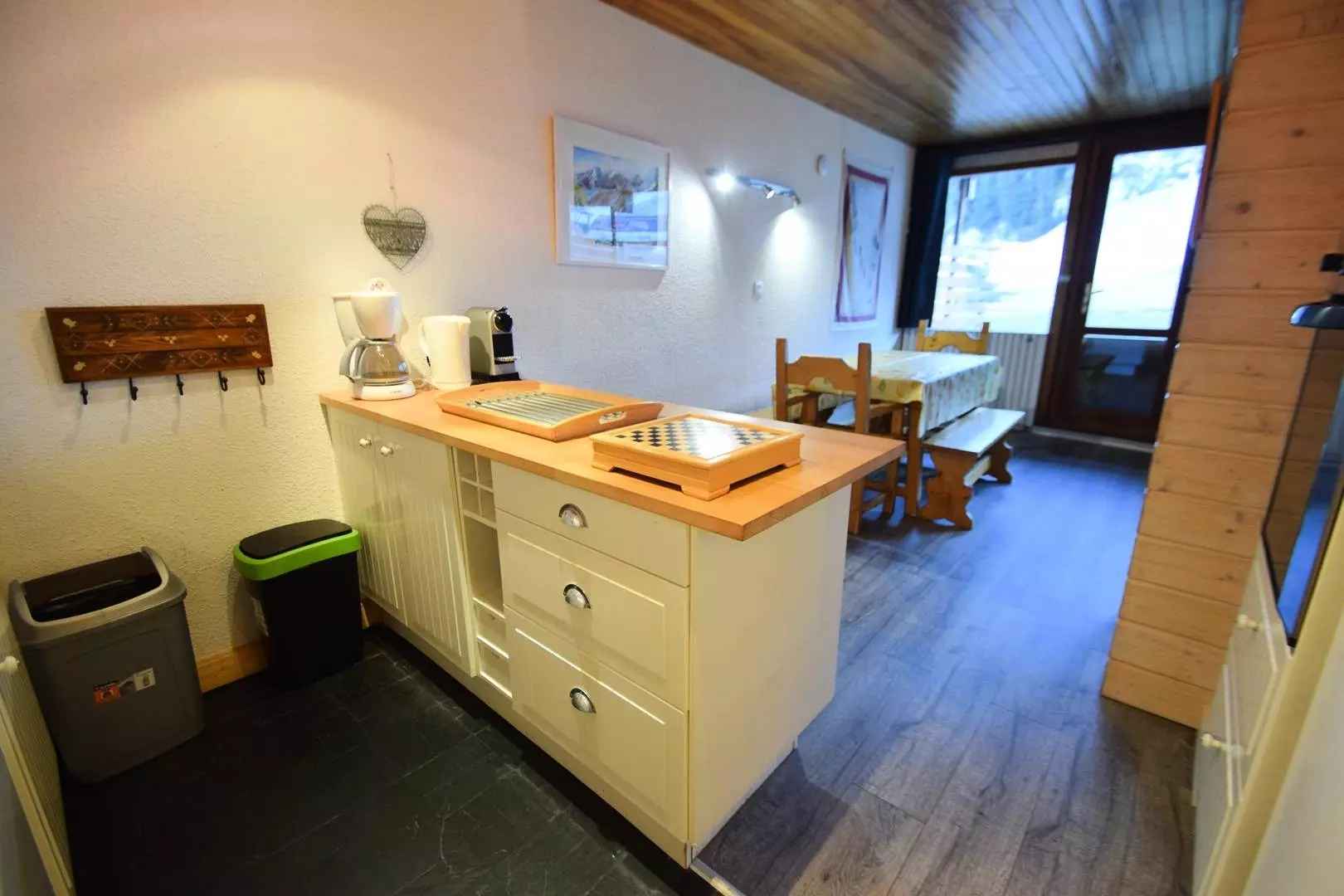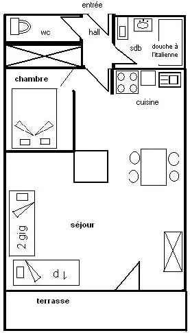 2 pièces, 5 pers, 41m2, idéalement placé sur les pistes, exposé sud, vue sur les pistes, au rez de chaussée avec terrasse (déneigement non garanti), de plain-pied sur pistes - sans ascenseur. cuisine ouverte : 3 plaques induction,
