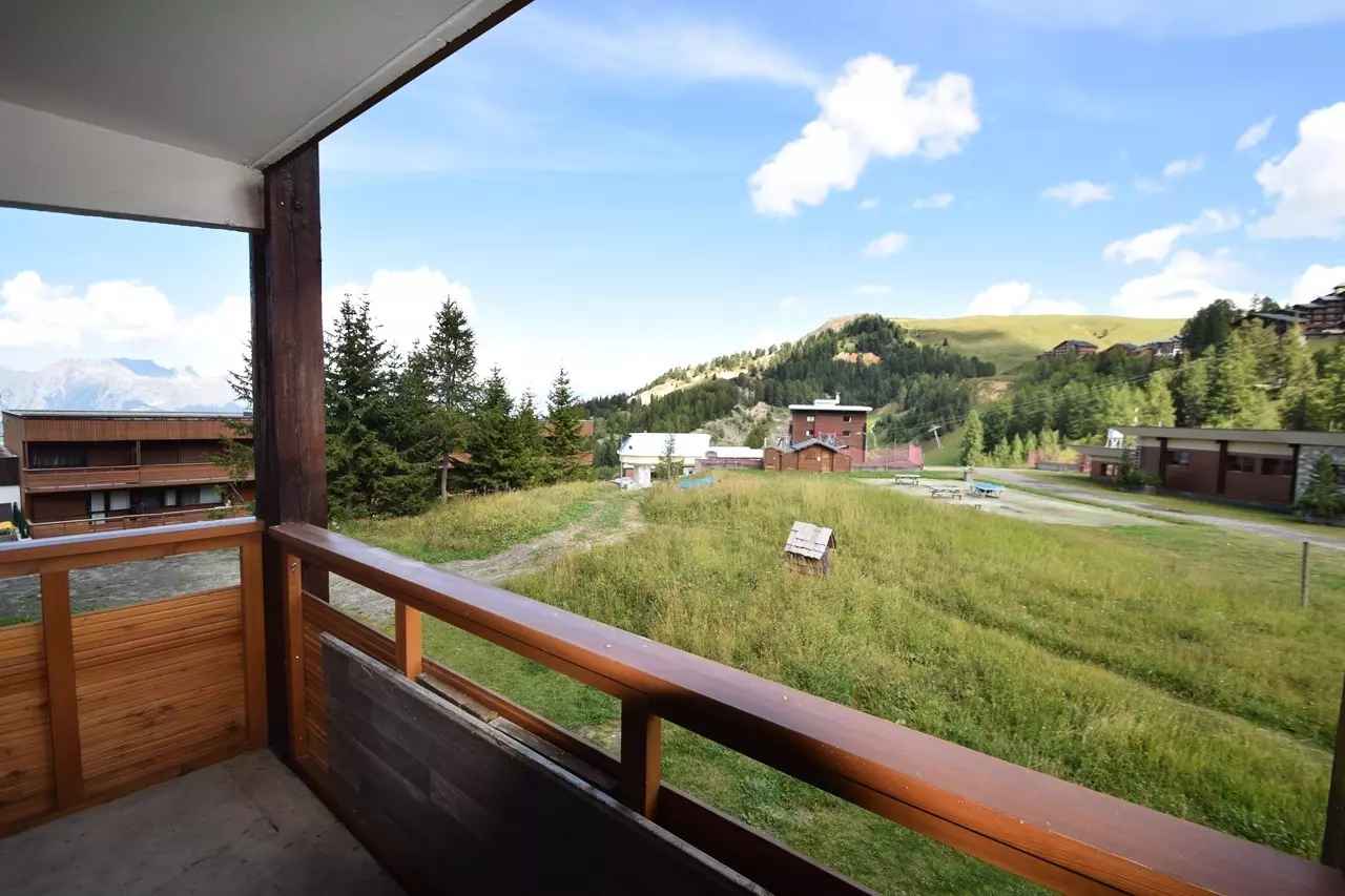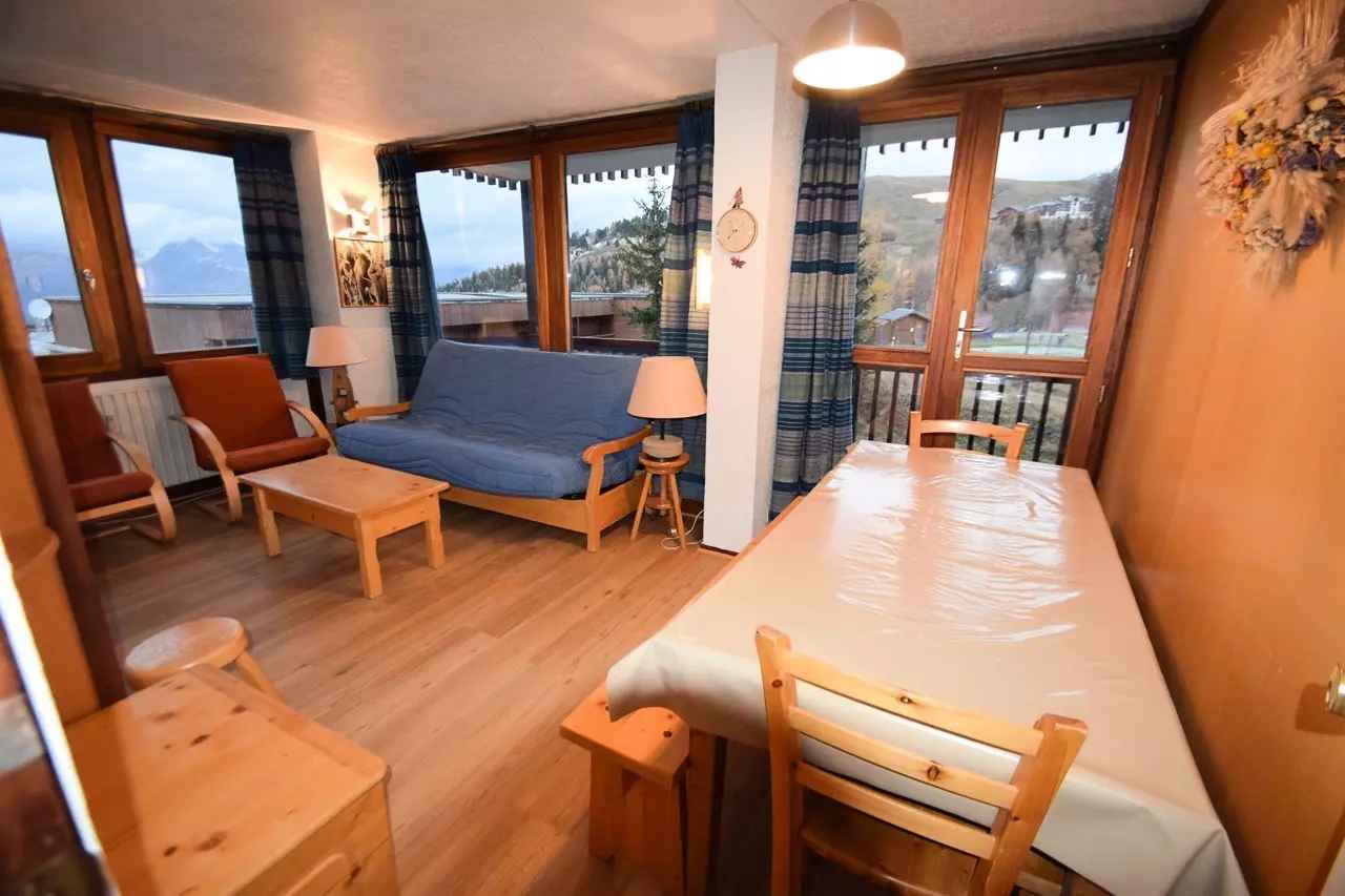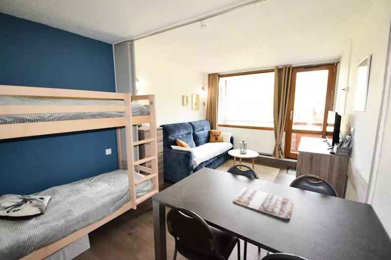 studio divisible 4 pers, 28m², expo est avec balcon, vue sur les pistes et la montagne, 2ème étage avec ascenseur. cuisine dans entrée : 2 plaques induction, réfrigérateur, lave-vaisselle, four micro-ondes, nespresso (dosettes non fournies) - séjour divisible : coin repas, tv, 1 canapé lit