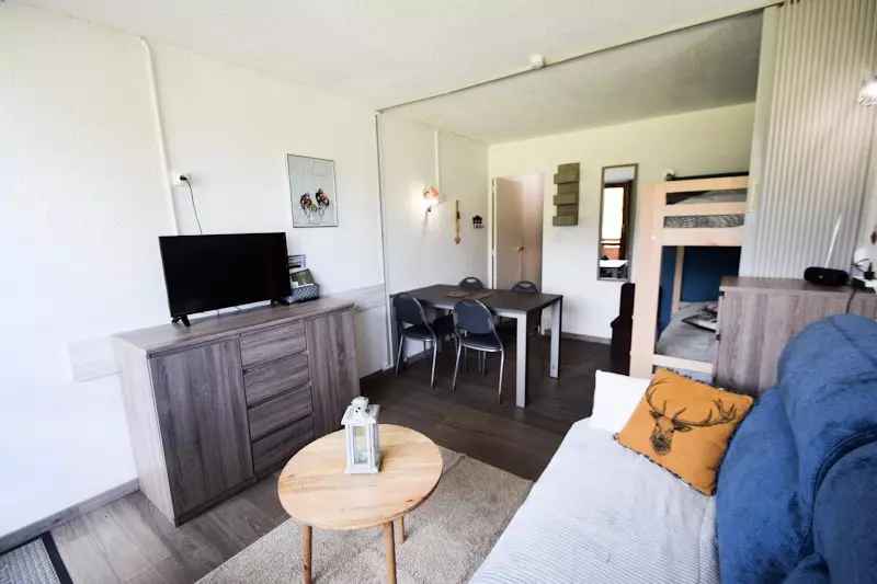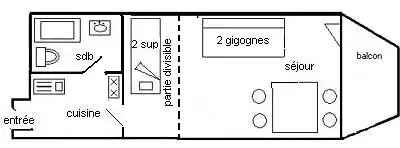 rapido (160cm) et 2 lits superposés séparés du séjour par une cloison accordéon. Salle de bain : baignoire et wc inclus Sols : PVC. - literie : 2 couettes simples et 1 couverture double - Appartement non fumeur, animaux non admis. En option et en supplément: Ménage de fin de séjour, draps, serviettes, forfaits ski.