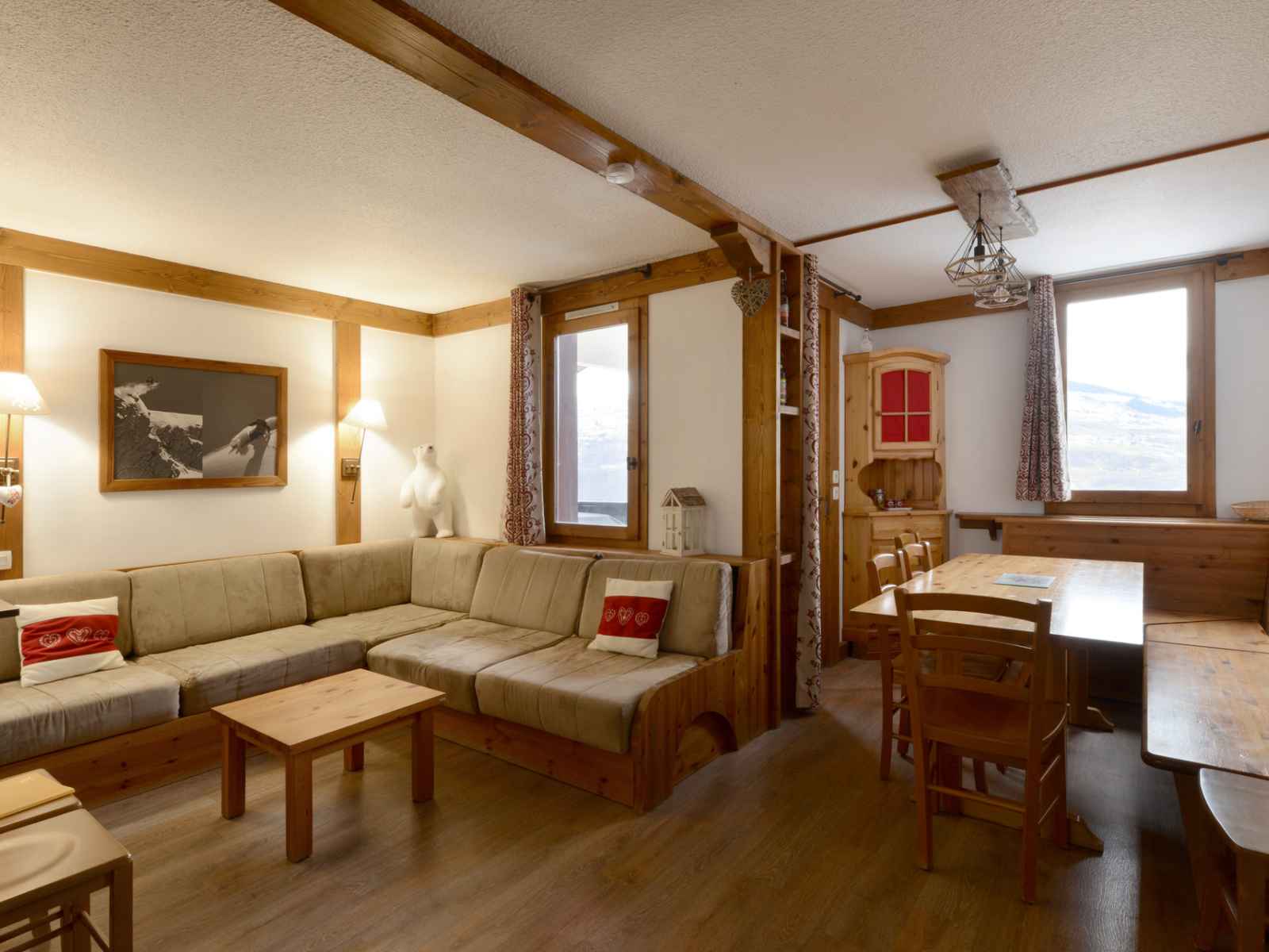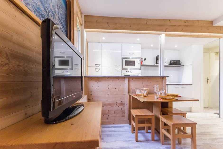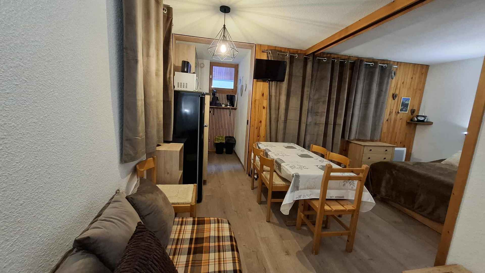 grille-pain, cafetière), d'une salle d'eau et wc séparé. Vous disposez d'une chambre avec deux lits simples. Le coin salon est également équipé d'un lit peigne. Pour votre confort vous disposez d'une télévision. Casier à skis à votre disposition. Ses atouts : - Appartement rénové - Petit balcon avec vue en partie sur la vallée et proche de l'Espace Paradisio - Couettes Linge et ménage de fin de séjour en suppléments. Animaux refusés. Appartement non fumeur