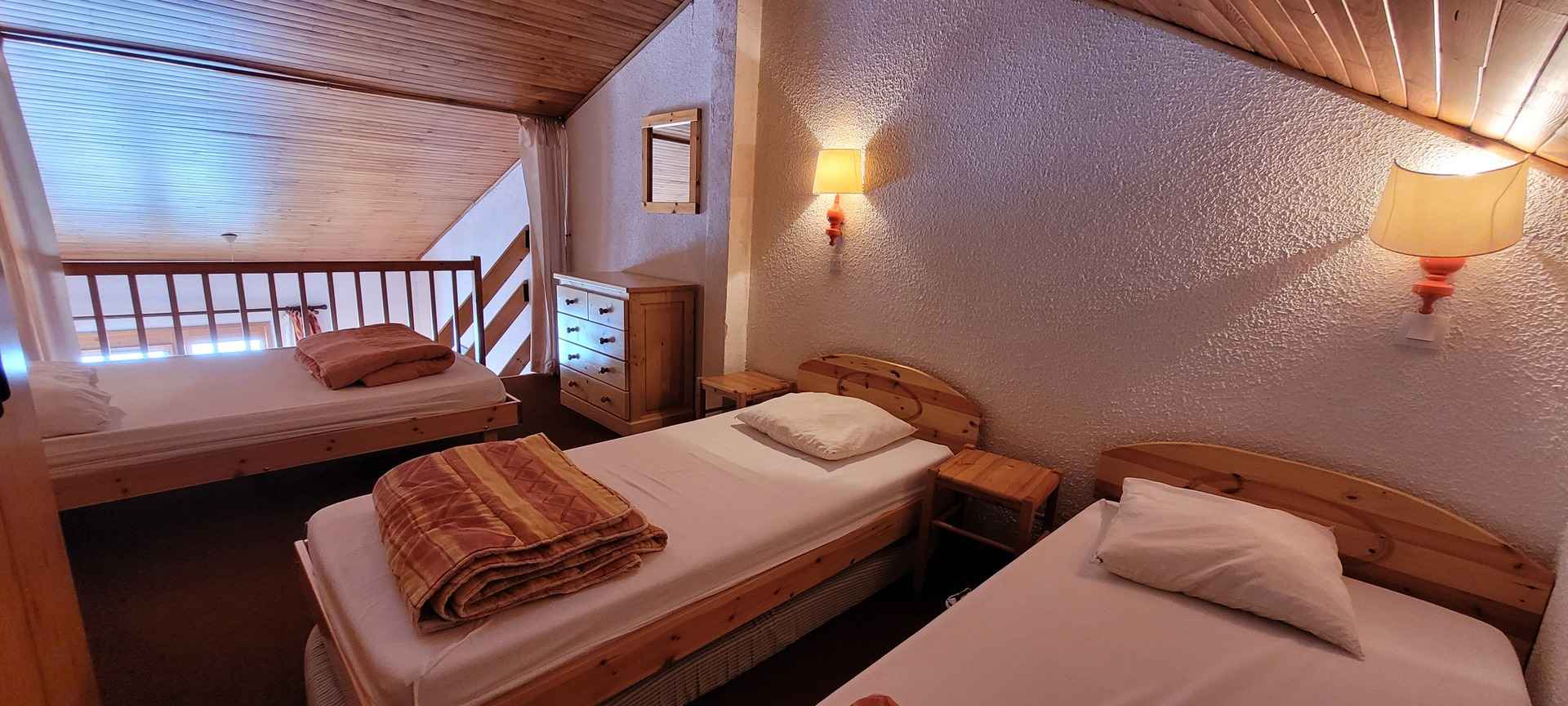 pistes. Il se compose d'un séjour avec 1 canapé lit convertible en 160 pour 2 personnes et TV écran plat, d'une cuisine ouverte sur le séjour avec mange-debout comptoir. La cuisine est équipée de plaques à induction, d'un réfrigérateur, d'un lave-vaisselle, d'un four et d'un micro-ondes. L'appartement est équipé de couettes Au 1er étage, chambre avec 4 lits superposés pour 4 personnes et salle de bain avec baignoire. WC séparés au 2ème étage. Pour le côté pratique un casier à skis est à disposition et la résidence est équipée d'ascenseurs. Pour votre information le linge de lit et le ménage de fin de séjour ne sont pas compris.