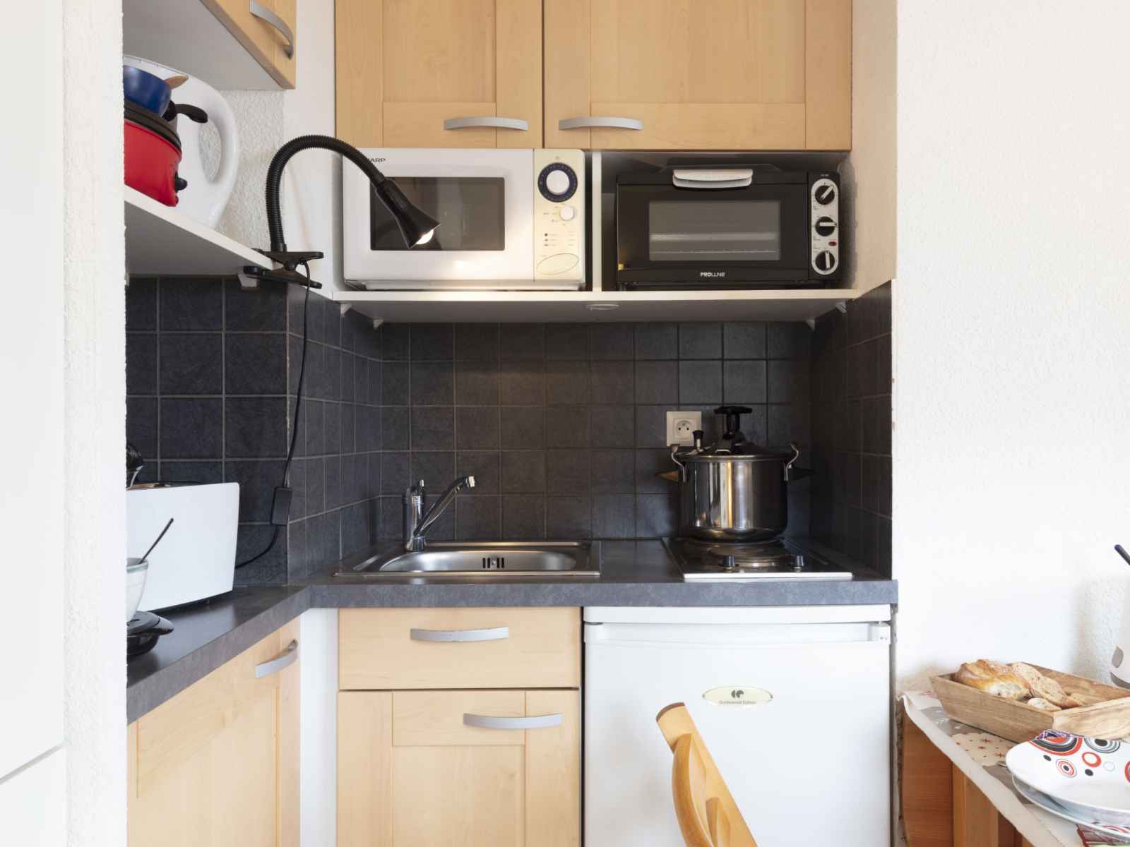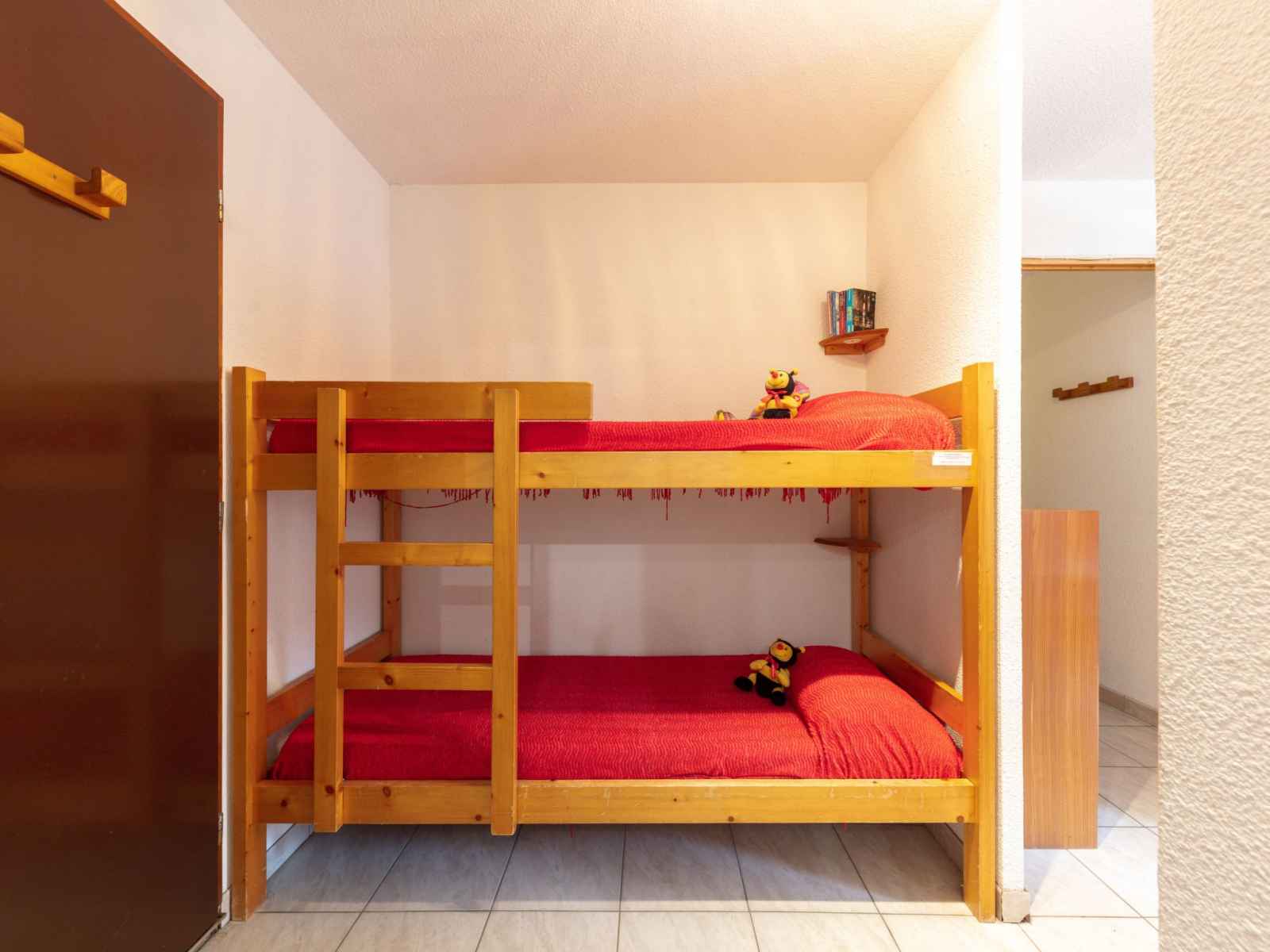 Apt 2 pièces 25 m2 au 1er étage. aménagement agréable: petit séjour/salle à manger avec tv (écran plat). sortie sur la terrasse. entrée avec 1 x 2 lits superposés (70 cm, longueur 190 cm). 1 chambre avec 1 grand-lit (140 cm, longueur 190 cm). coin cuisine (2 plaques de cuisson, mini-four, grille-pain, bouilloire électrique, micro-ondes,