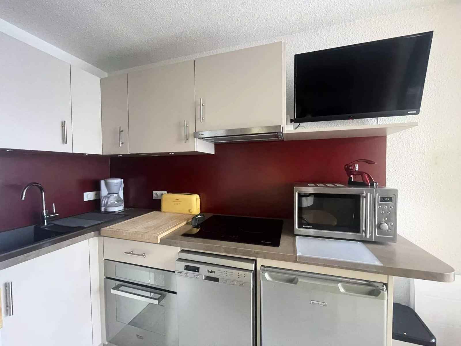 La cuisine avec son spacieux plan de travail dispose d’un lave-vaisselle, plaque de cuisson, four encastré, micro-ondes, hotte, réfrigérateur, cafetière, grille-pain, appareil à raclette, vaisselle et ustensiles de cuisine.