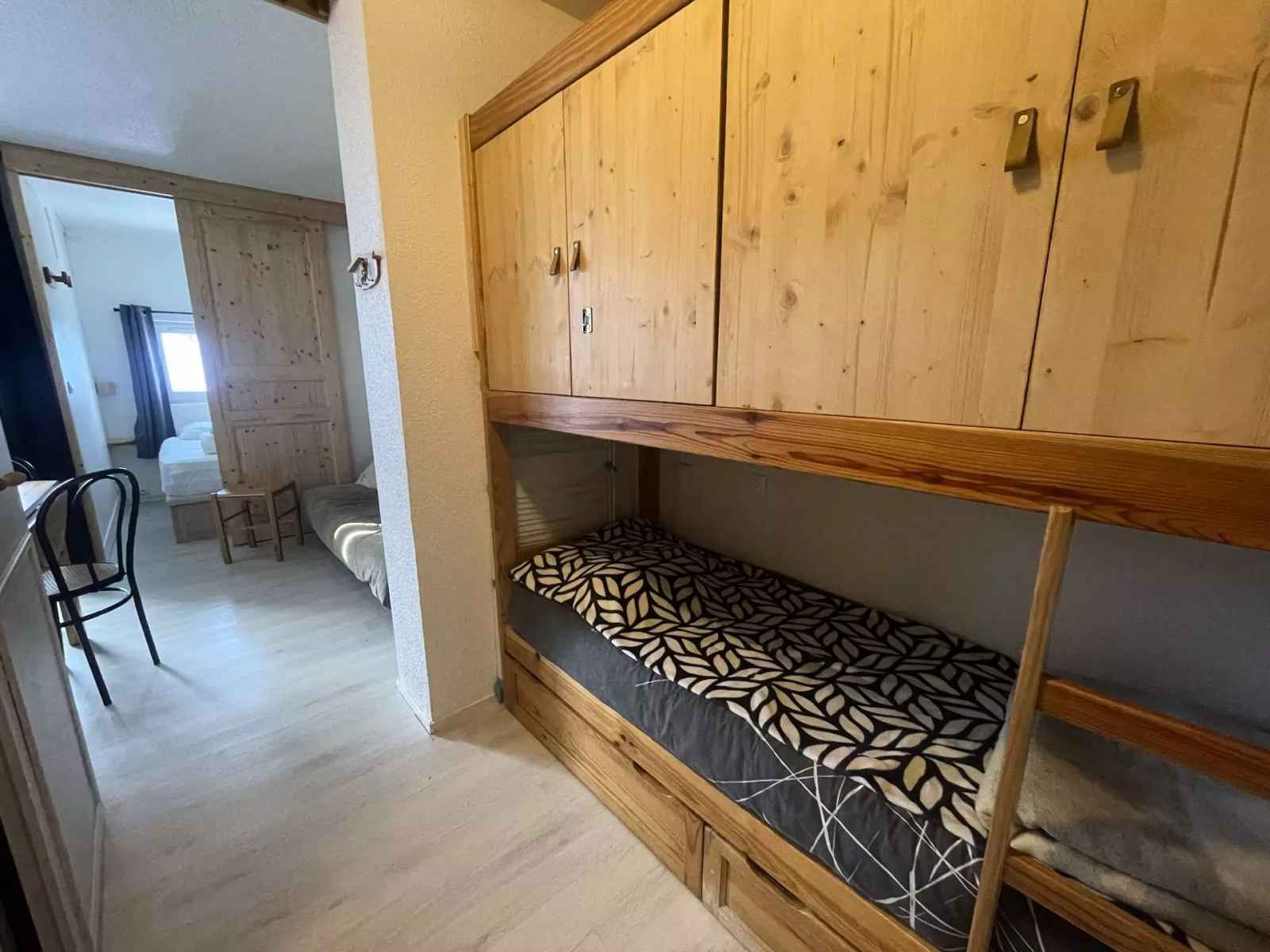 vous trouverez un miroir en bois et des porte-manteaux, le coin montagne comprend un lit de 90*190 équipé d’une lampe et prise électrique, ce qui permet de lire et recharger un téléphone. Au-dessus vous accèderez à un placard pour le rangement de vos affaires personnelles ainsi qu’un espace pour déposer vos valises.