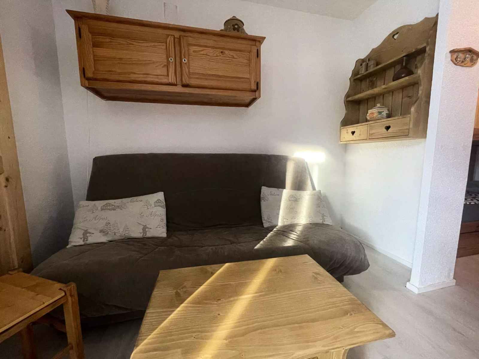 Le séjour comprend un clic-clac, une table basse, un meuble étagère avec deux tiroirs en bois de style " Cœur de Montagne ", TV Chromecast intégré.