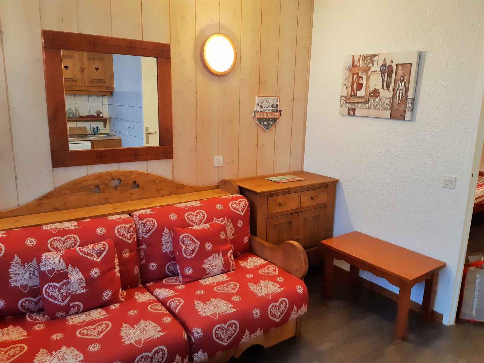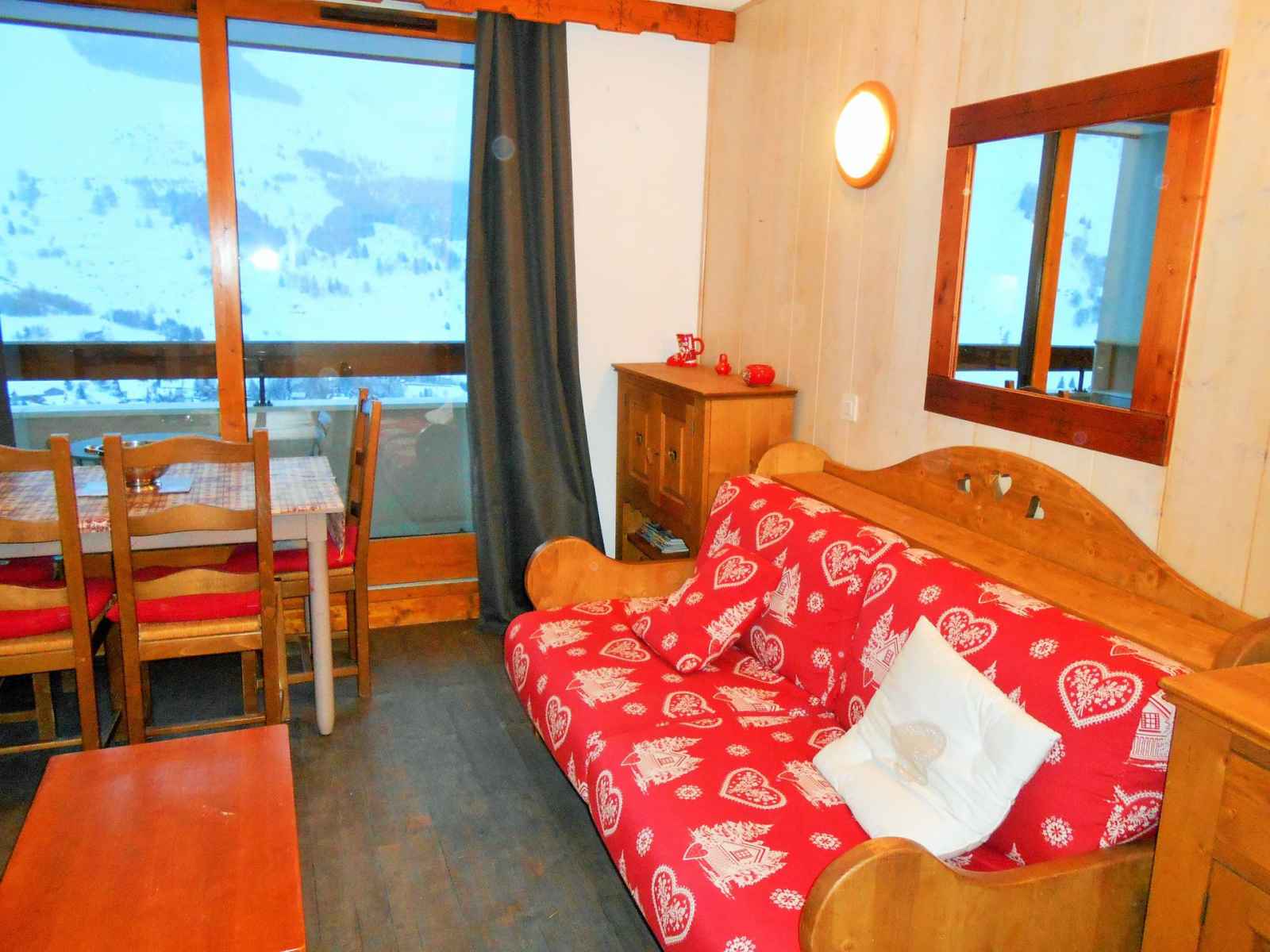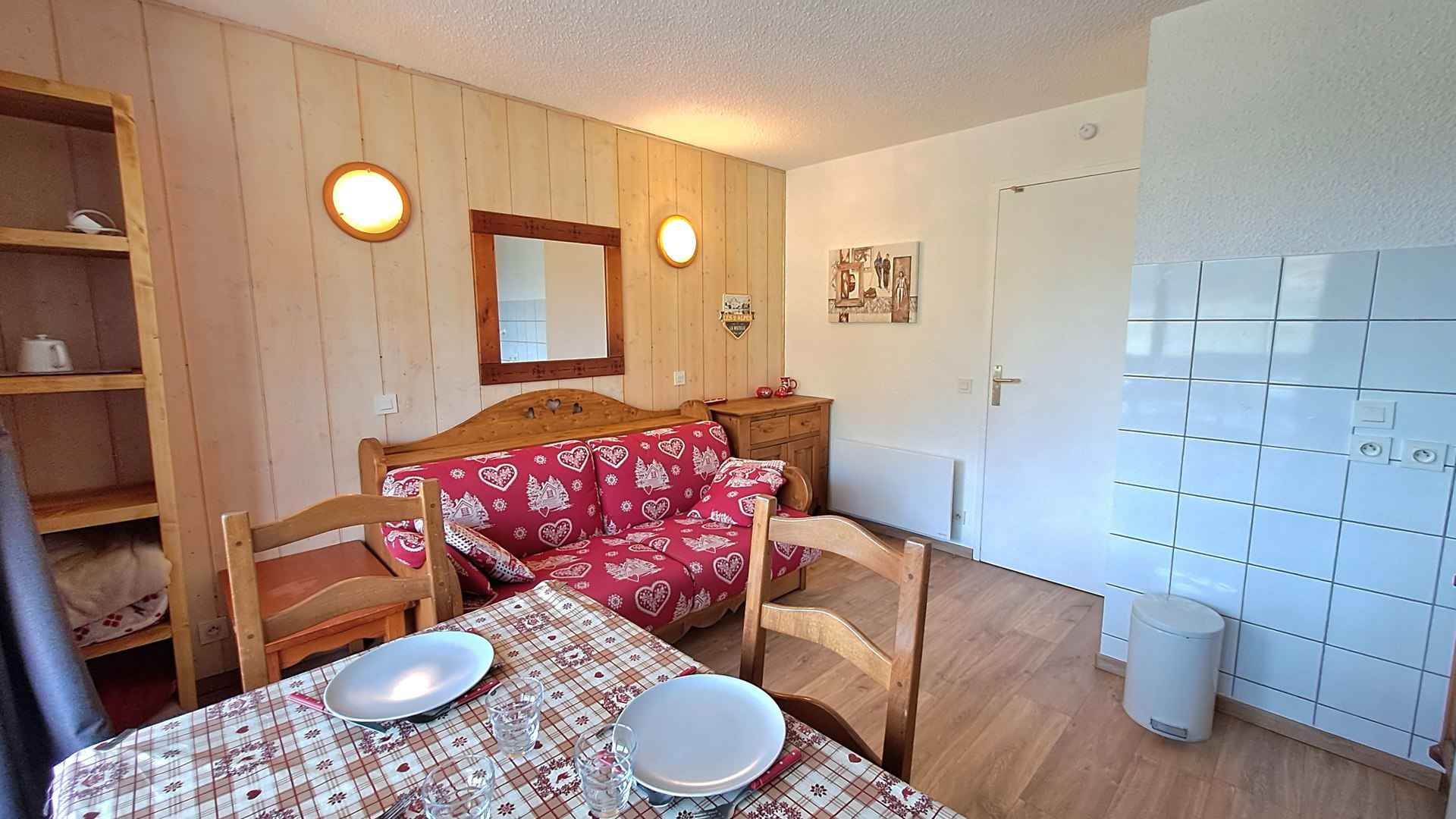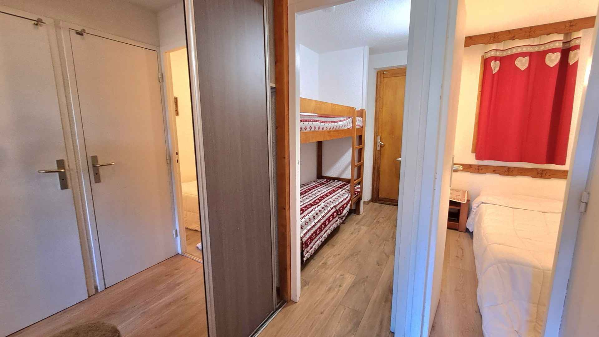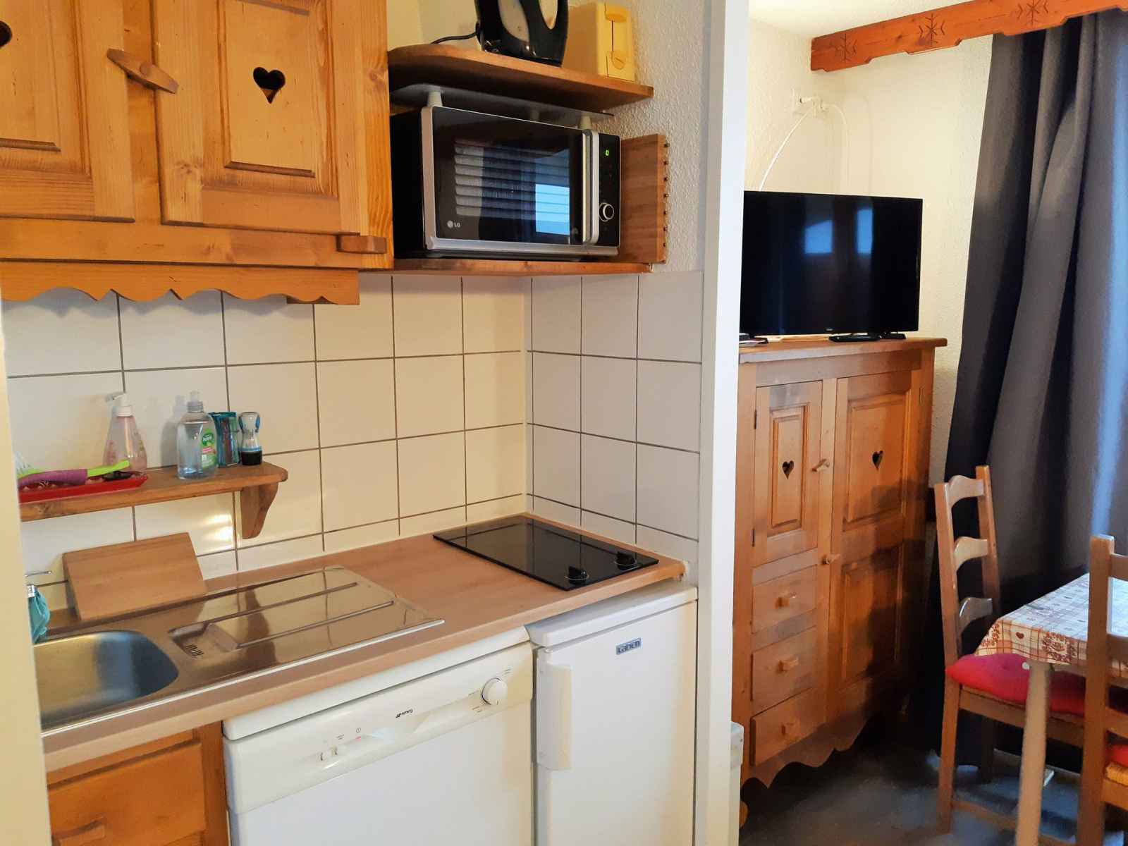 sol Cuisine : ouverte sur le séjour. Equipements : 2 plaques vitrocéramiques, micro-onde, réfrigérateur, lave-vaisselle, cafetière, bouilloire, grille-pain. Couchages : - Chambre : 1 lit double (140x190) - Séjour : 1 canapé convertible (lit double : 140x190) Coin nuit : 2 lits simples superposés (70x190) Couchage supérieur déconseillé aux – de 6 ans Le coin nuit est situé dans le couloir séparé du salon par une porte. Sanitaires : Salle de bain avec baignoire WC séparés. Divers : Casier à ski Place de parking privative couverte, pour voiture standard Animaux interdits Le linge de lit, le linge de maison, les serviettes, le wifi ainsi que le ménage de fin de séjour ne sont pas inclus (à réserver au plus tard le jour de votre arrivée et sous réserve de disponibilité).