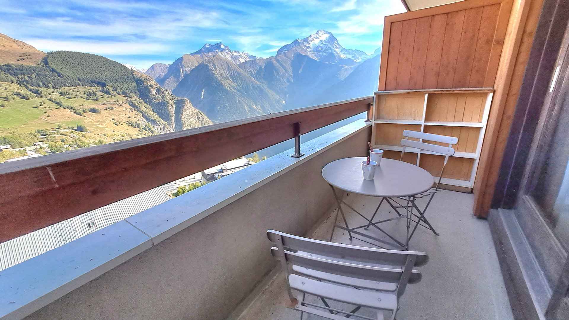 balcon exposé est, avec vue sur les montagnes et sur les pistes.