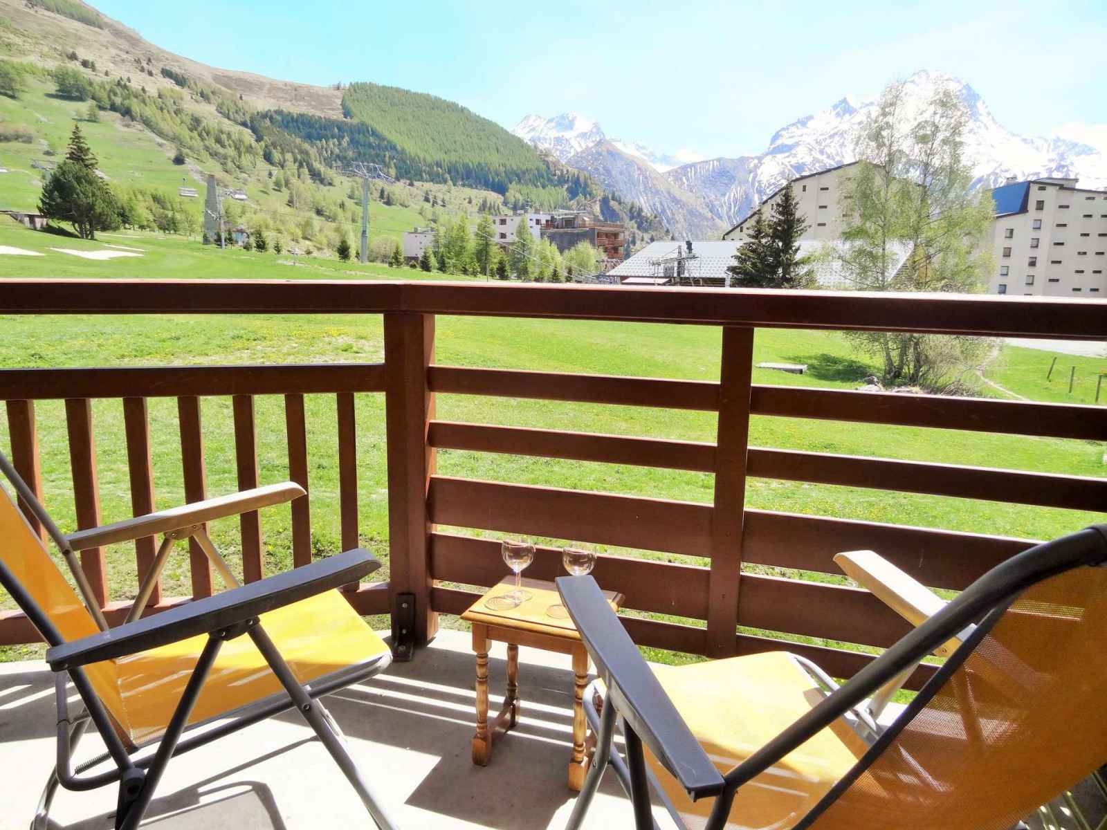 balcon exposé sud, avec vue dégagée sur les pistes et les montagnes.